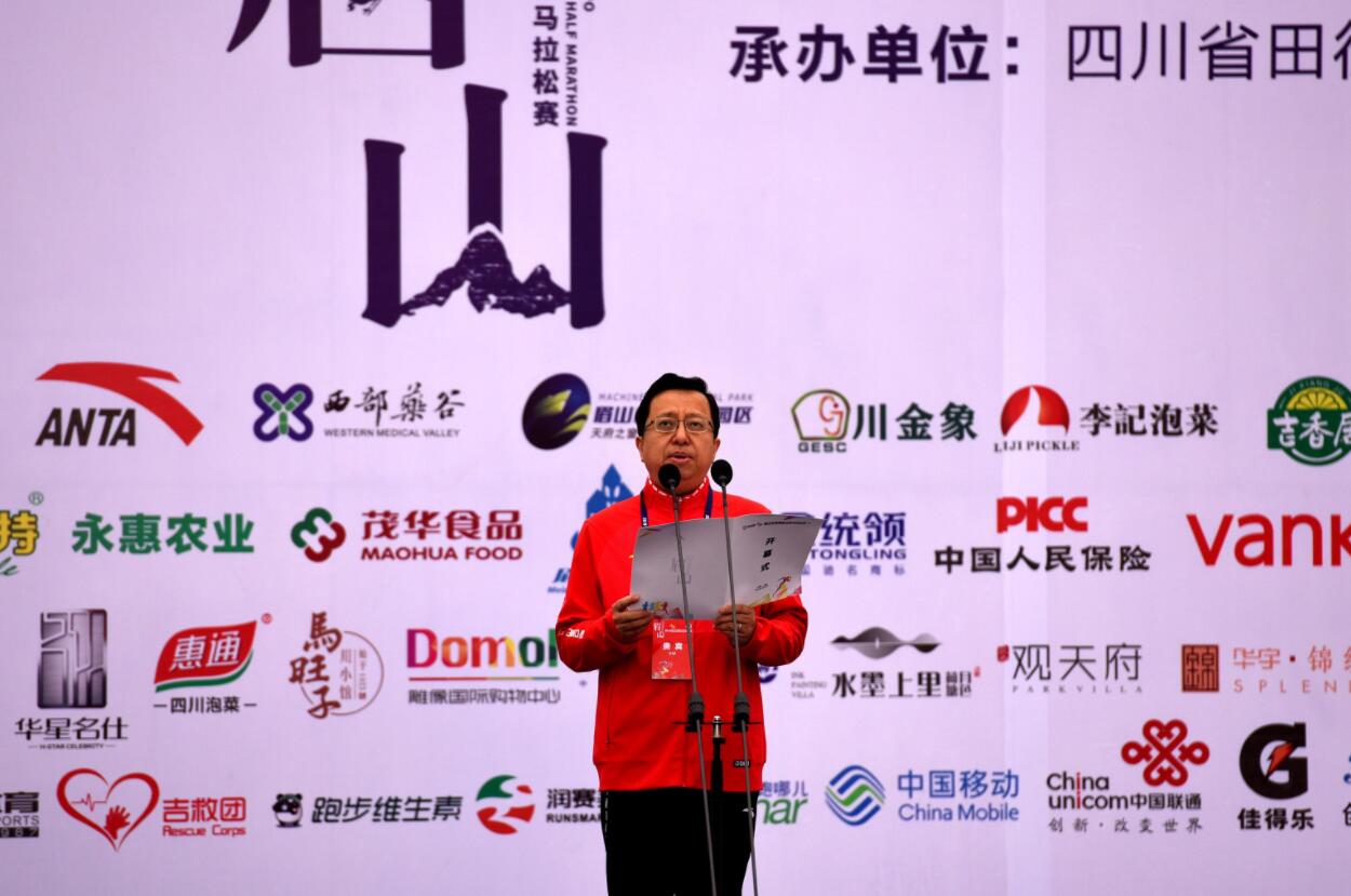 東道主中共眉山市委書記慕新海在開賽儀式上致辭。他說,眉山是蘇東坡的故鄉,他不僅是一位大文豪,也是一位跑步達人,長期堅持晨跑,給了他健康的體魄、豁達的胸懷、超凡的才情。作為東坡故里,眉山是一個逐夢奔跑的年輕城市,是國家級天府新區的重要組成部分,正全面與國家中心城市成都同城發展,在開放發展的賽道上,跑出眉山加速度!