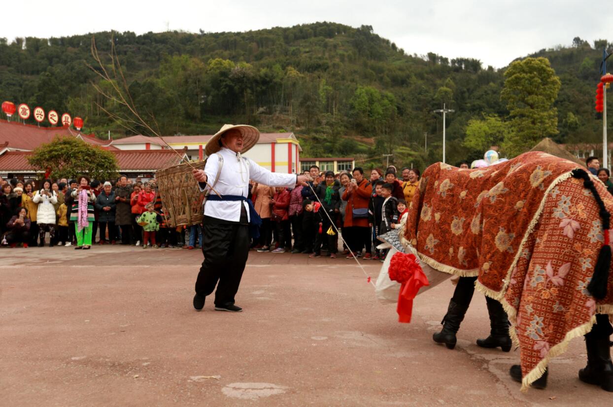 這邊春酒未畢,那邊「牛牛燈」表演開場。一人背着牛草背篼牽着牛,嘴裏唱着與勞動生產、節慶等有關的祝福語,不時還用鞭子抽打停下來吃草、休息的牛;二人身批「牛皮」飾牛,在行進的過程中,牛一會兒停下來吃草,一會兒坐卧,一會兒追打牽牛人,把生活中牛的各種情態表演得淋漓盡致。牛是以前耕作的主角,大家以「牛牛燈」勉勵勤勞,提示春耕的到來,祈禱今年風調雨順。