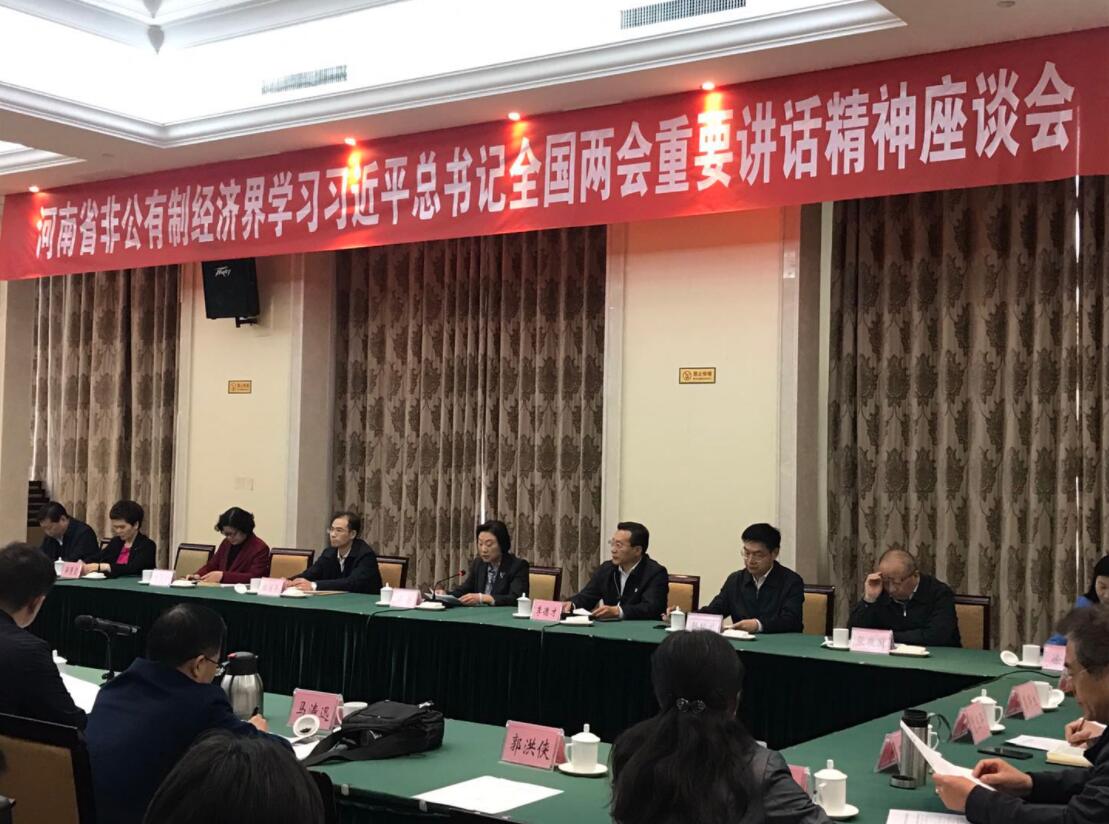 河南省工商聯副主席趙純武領學習近平總書記全國兩會期間重要講話精神,河南省工商聯副主席程國平、孔火團、張敬國、徐勝傑,河南省工商聯秘書長馬躍峰等出席會議,各省市工商聯主要負責同志,部分省直屬商會和民營企業負責人參加座談會。