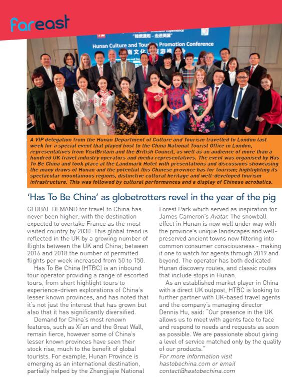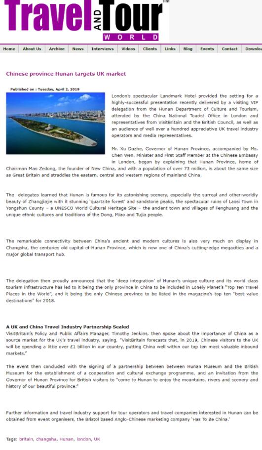 英國旅遊業界專業期刊Travel and Tour World發文《中國湖南省精準對接英國旅遊市場》