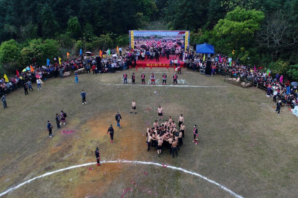 【香港商報網訊】4月7日,廣西柳州市融安縣板欖鎮舉行山歌節,近三百名青年男女在山歌節現場爭搶花炮,吸引眾多遊客前來觀看。