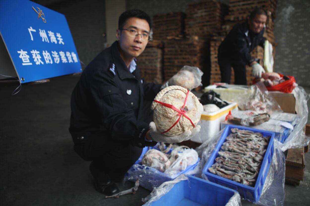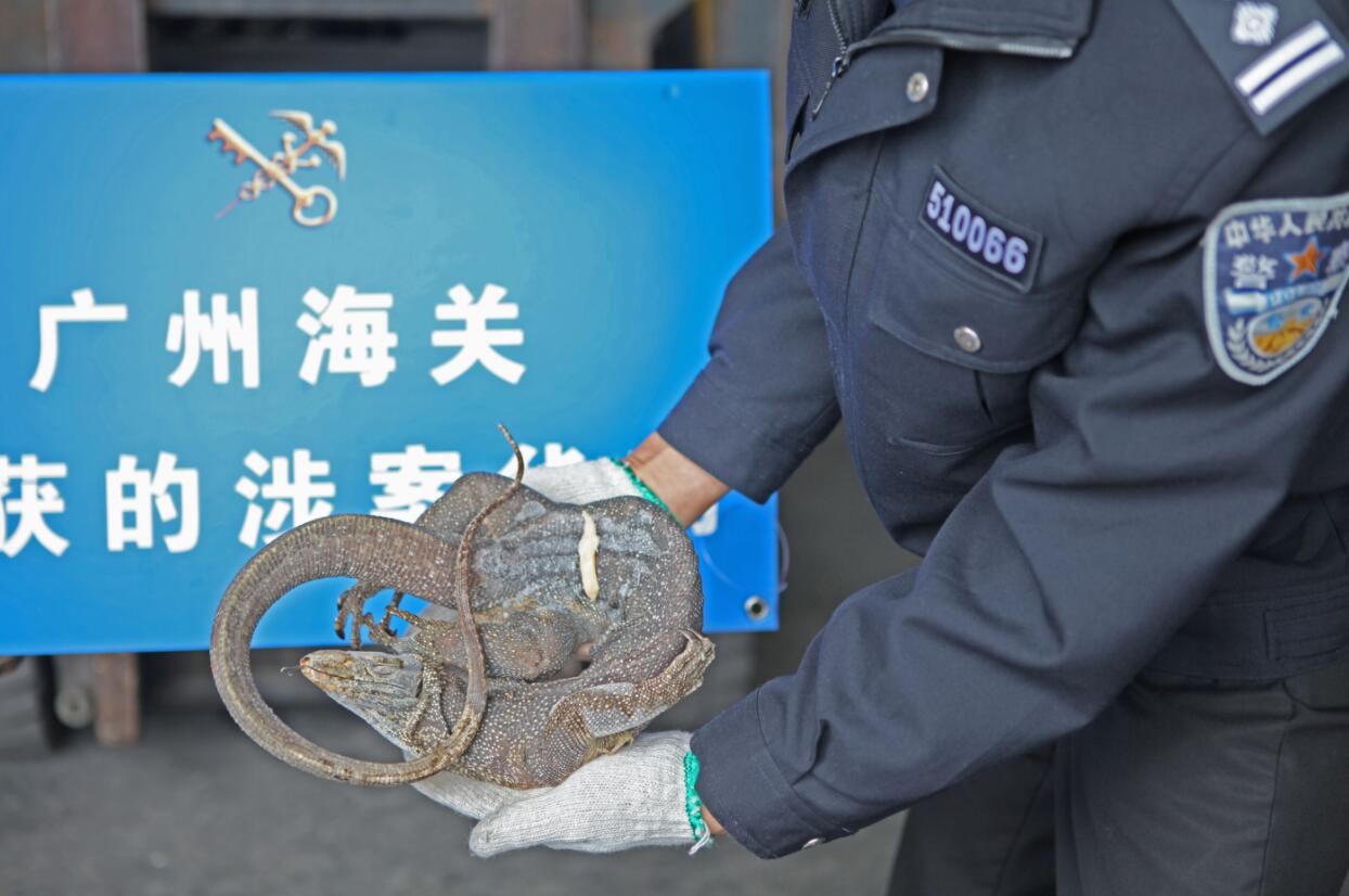 【香港商報網訊】廣州海關4月10日消息,3月24日至25日,廣州海關出動緝私警力95人次,分別在佛山、清遠、河源等地查獲3起走私進口瀕危物種案,抓獲犯罪嫌疑人9名,查獲涉嫌從中越邊境非設關偷運走私進境的冰凍穿山甲5隻,穿山甲肉5.5公斤,穿山甲鱗片1.5公斤,蛤蚧74.04公斤,蜥蜴15.1公斤,扣押涉嫌贓款100餘萬元。