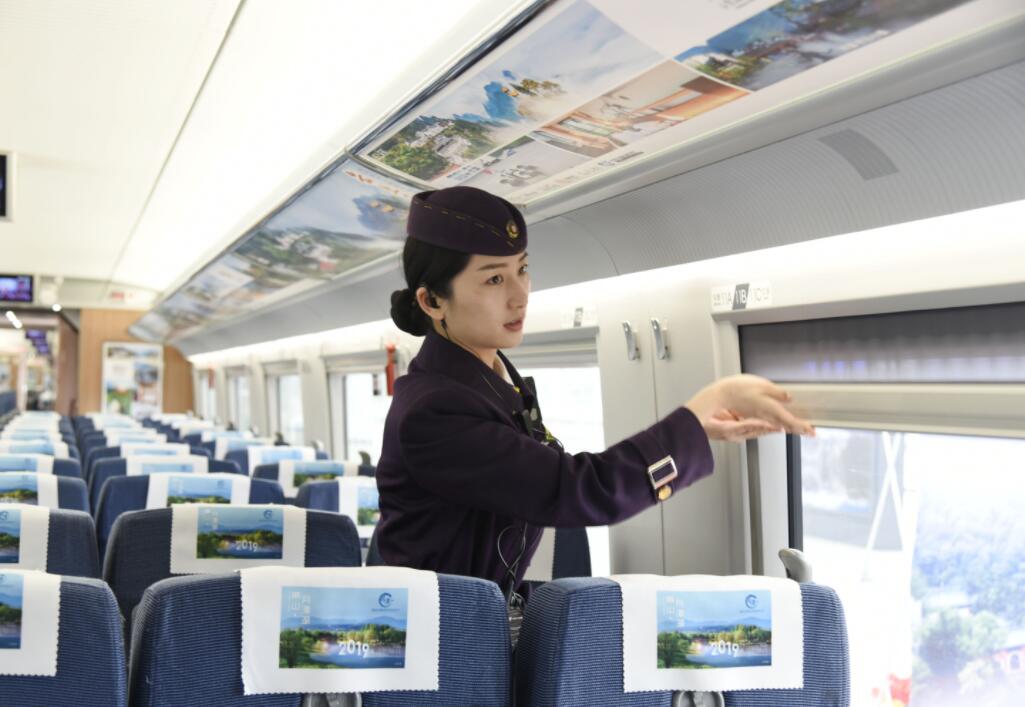 「歡迎您乘坐『休寧齊雲山月潭湖』品牌列車……」跟隨着車廂內語音播報走進車廂,記者看到,車廂內隨處可見齊雲山風景區、月潭湖景區等主要旅遊資源,而頭片、小桌貼、海報、品牌天幕等多種媒介都巧妙嵌入休寧文化旅遊元素,這讓高鐵瞬間換身成為休寧文化旅遊的移動宣傳站。