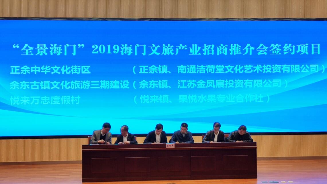 會上,海門市文化廣電和旅遊局局長陳忠新發佈了「周末海門」一日游「人文之旅」、「 美景之旅」、「 購物之旅」、「 研學之旅」 四條精品線路,二日游「江海風韻」漫慢游、「江海門戶」生態游 、「江海田園」休閒遊三條精品線路。會議期間,還舉行了張謇文化旅遊景區獲評國家4A級旅遊景區揭牌儀式、「江海之門」全域旅遊智慧商圈平台開通試運行啟動儀式。現場共簽約正余中華文化街區、余東古鎮文化旅遊三期、悅來萬忠度假村等9個文旅項目,協議投資總額人民幣63.46億元。(杜林 趙振華 俞新美)