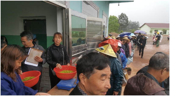 採茶工排隊交售剛採的茶青