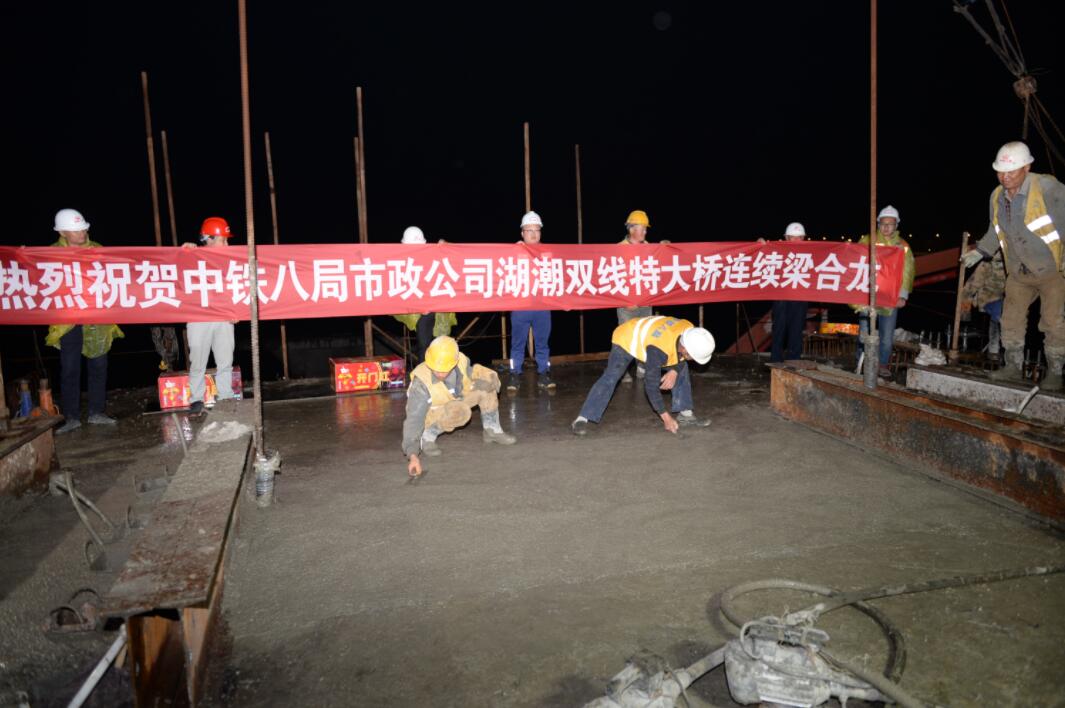 據了解,湖潮雙線特大橋全長2.5公里,共計76個墩台,是西南環線最長的特大橋之一,橋樑結構複雜,施工難度大,大橋平行於既有滬昆線,且連續樑上跨運油專線鐵路,施工地勢狹小,安全風險係數高。此次合龍的連續梁屬於較大跨徑的懸臂樑橋,故項目部採用菱形移動掛籃懸臂澆築施工,3組掛籃設備同時平行作業。掛籃是懸臂施工中的主要設備,可就地分段懸臂作業,它不需要架設支架,也不需要使用大型吊機,較其他方法而言,掛籃施工具有自重輕、拼裝簡單方便、無壓重等優點,並具有較強的可重複利用性,節約項目成本的同時有效縮短了工期。為保證既有線行車安全,項目部制定了施工安全保證措施和應急方案,對施工人員進行技術交底和崗前培訓,加強過程管控,定期安全檢查,確保了安全生產。