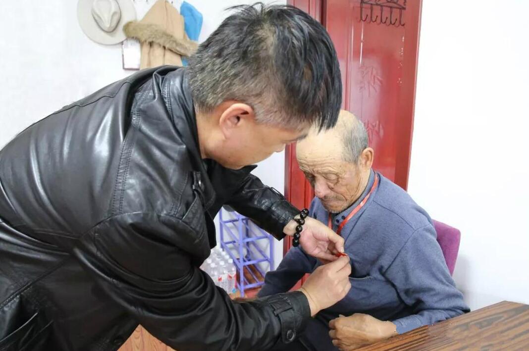 當志願者為建國前老幹部趙久仁佩戴上國旗徽章時,紅了眼眶的他臉上展現出燦爛的笑容。現年87歲的李玉江老人精神抖擻,不難看出年輕時是位勇敢的戰士,在1950年參加過抗美援朝,1951年榮獲三等功2次,在他的家中,志願者為他佩戴上了國旗徽章,他激動得說:「有國才有家,我們現在很幸福!」