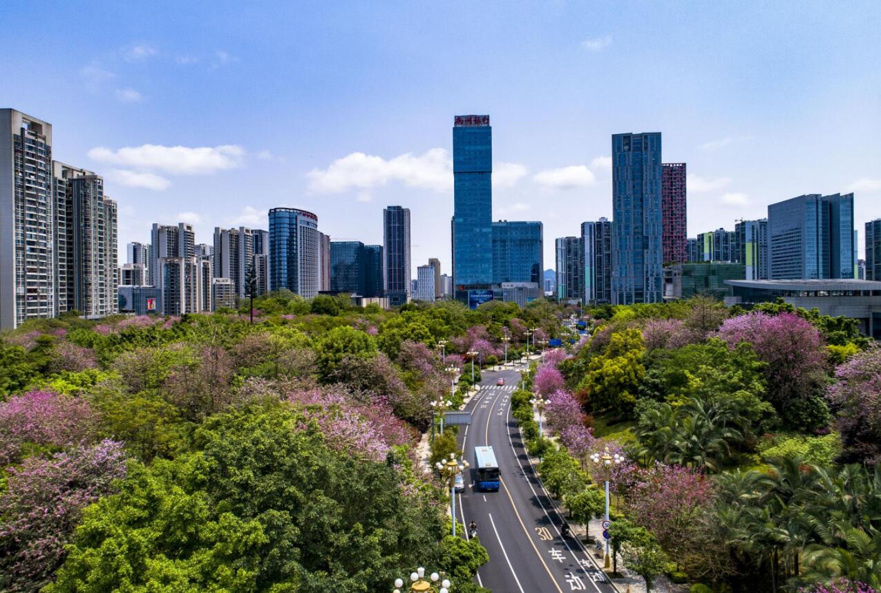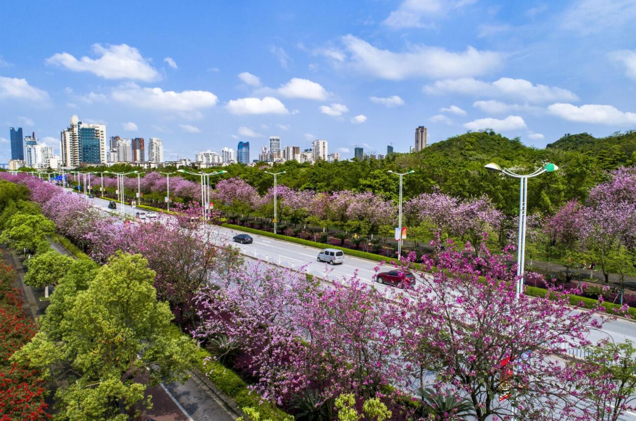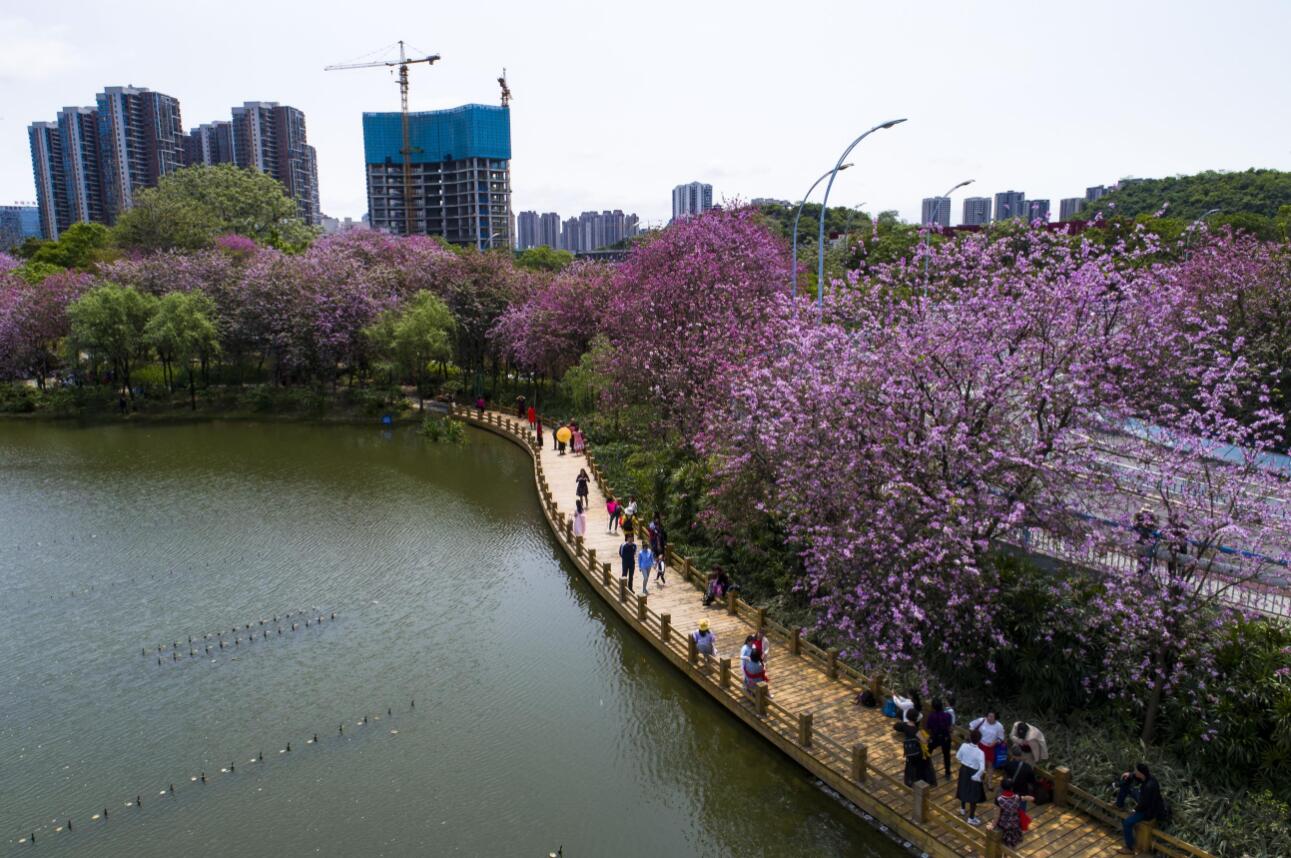 近日,廣西天氣漸暖,柳州市種植的27萬株洋紫荊絢爛綻放,進入一年一度的盛花期,將城區裝點成了粉色花海,吸引無數市民和遊客前來觀賞。