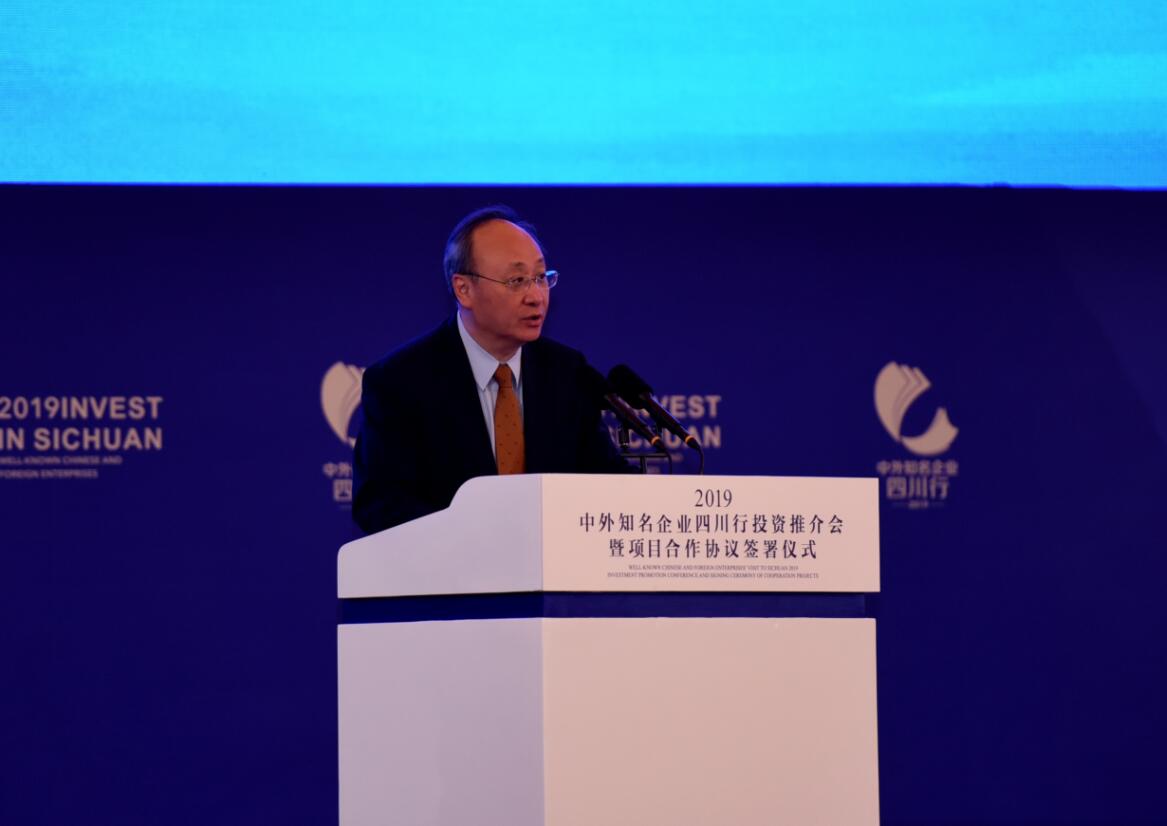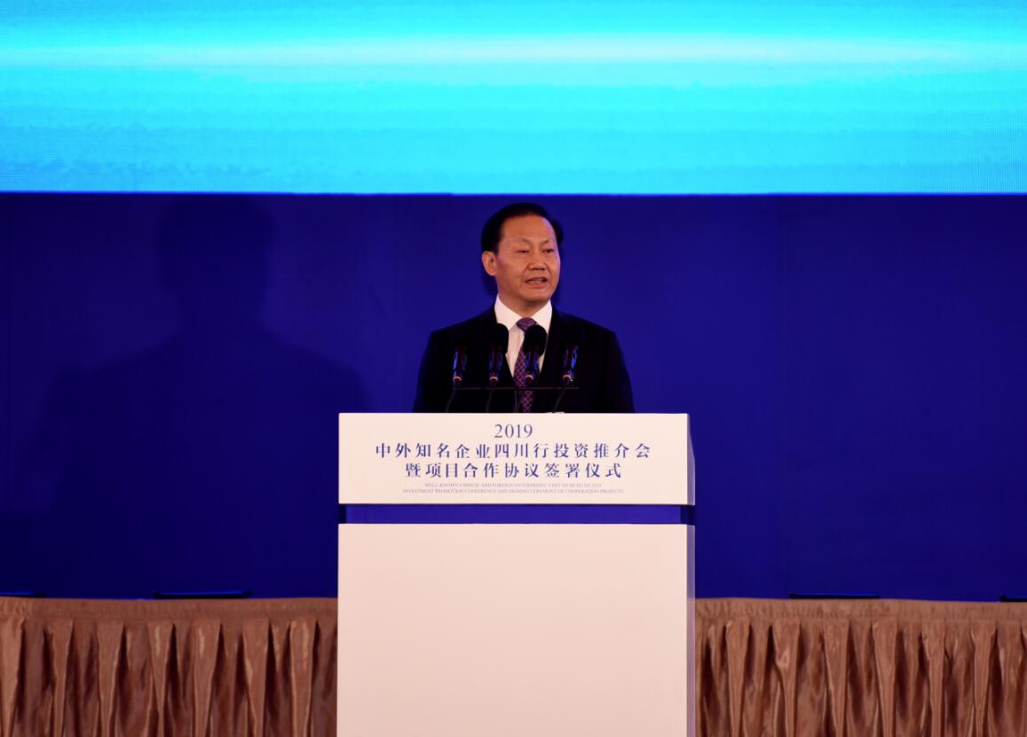 在當天上午舉行的投資推介會暨項目合作協議簽署儀式上,中共四川省委書記彭清華出席會議並致辭;四川省政府省長尹力主持會議。彭清華說,經濟全球化是不可逆轉的歷史大勢,只有堅持開放合作才能贏得更多發展機遇和更大發展空間。當前,四川發展已經站在新的歷史起點,區位優勢更加凸顯、資源稟賦十分富集、平台載體更加完備、交通條件日益改善、發展環境不斷優化,為更好促進開放合作、實現轉型發展創新發展跨越發展,打下了堅實基礎、創造了有利條件。熱忱歡迎廣大海內外企業來川投資興業,分享四川改革發展紅利、共同譜寫互利共贏新篇章。四川期待與大家在區域協調發展上深化合作,吸引更多領軍企業在成都建設區域總部和研發中心,立足成都、輻射西部,在新一輪西部開放開發中搶佔先機。期待與大家在特色優勢產業上深化合作,聚焦四川重點培育的五個萬億級支柱產業,聚焦以數字經濟為引領的新技術、新業態,充分利用四川的優勢資源和企業的雄厚實力,有機融合、互利共贏。期待與大家在基礎設施建設上深化合作,搶抓國家加大基礎設施等領域補短板力度的機遇,在高鐵、高速公路、港口航運、專業服務等領域尋找商機,深度參與四川現代綜合交通運輸體系建設,共筑西部陸海聯運新通道。期待與大家在消費提質升級上深化合作,推動電子商務、現代金融、商貿物流、文化旅遊、健康醫療等服務業高質量發展,提供更多高品質、個性化、多樣化的消費產品,共拓服務供給新空間。期待與大家在推動鄉村振興上深化合作,積极參与四川現代農業園區建設、特色農產品品牌打造、脫貧攻堅,在推動農業強、農村美、農民富的進程中壯大企業、造福人民,共創幸福美好生活。