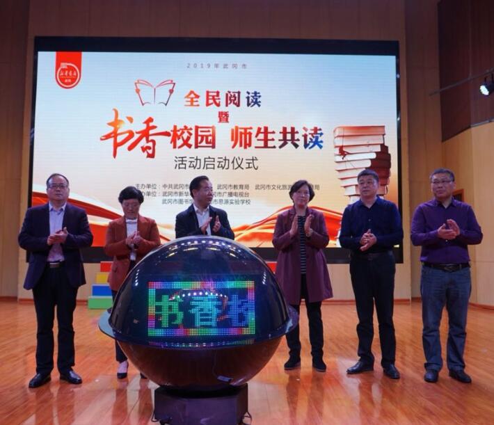 武岡市委常委、宣傳部長羅健,市人民政府副市長李巧雲,市政協副主席曾姝瓊等領導共同摁動啟動球,宣佈2019年武岡市“全民閱讀暨書香校園·師生共讀”活動正式啟航。
