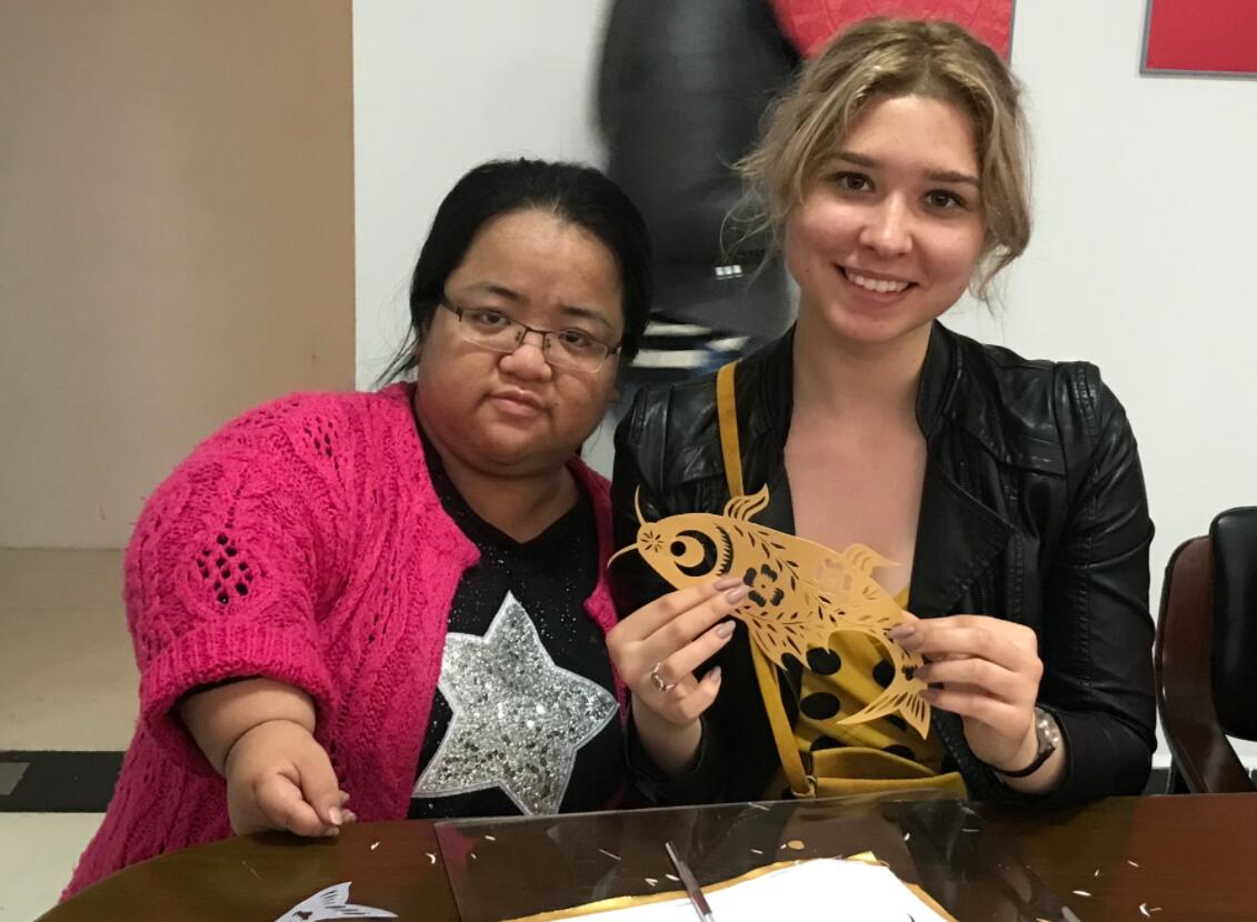 在工藝美術大師(刻紙類)楊兆群的示範工作室內,外籍友人在刻紙師傅們的教學帶領下體驗了一番由隋唐時期傳承下的古老金壇技藝。來自俄羅斯的Kolosova Antonina 最先在師傅的幫助下完成了福魚刻紙,當她從紙模版下抽出金色的成品時不禁讚歎了一聲,並連聲對一旁的工藝師傅道謝。「一開始體驗刻紙的時候並沒有注意到中間夾層藏着的金紙,這是一次很難得的體驗。這樣的親身實踐與從影像中去感知是完全不同的,如果我只是從電視或畫冊上了解到刻紙,可能只會認為它很美,但是只有親身參與後才能體會到隱藏的鮮活魅力。」Kolosova Antonina說。