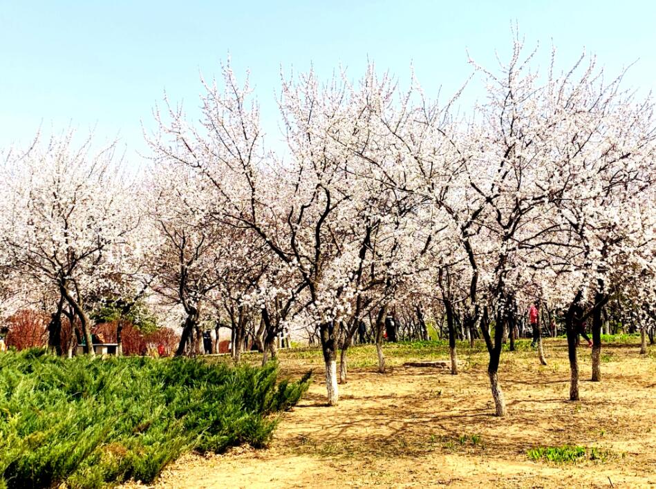 御花園內的千餘株杏花,構成一個景區,名曰「杏林花坡」。「杏子梢頭香蕾破,淡紅褪白胭脂涴」,這是蘇東坡的讚歎,杏花承載着梅花的風骨和清高,卻有着獨特的嬌弱和嫵媚。遠遠地望去,那一樹一樹的雪白,渲染着春天的活力。(冀文嫻 王丹)