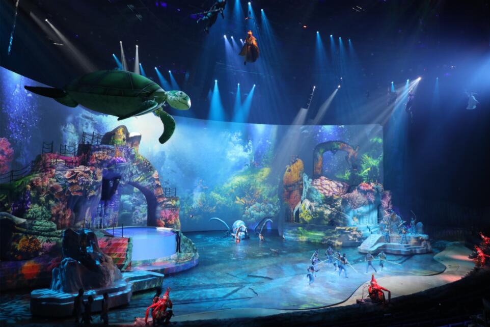 記者在現場看到,《青秀》以八仙參加王母宴會後,馭水過海時與龍王發生爭執,七仙為救被擒的藍采和與四海龍王激斗的劇情徐徐展開。現場,超大水舞台及投影弧幕、首創表演用造浪系統、大型水幕噴泉等,上演了一場亦真亦幻的海洋奇觀。現場還有逼真的海龜、水母等飛行道具在觀眾頭頂掠過以及全息投影營造的海浪。舞台開合間,宇宙、海底、群山等不同維度空間的場景逼真顯現,各種高科技手段糅合音樂、舞蹈、雜技等多種表演形式,帶來強烈視覺衝擊。