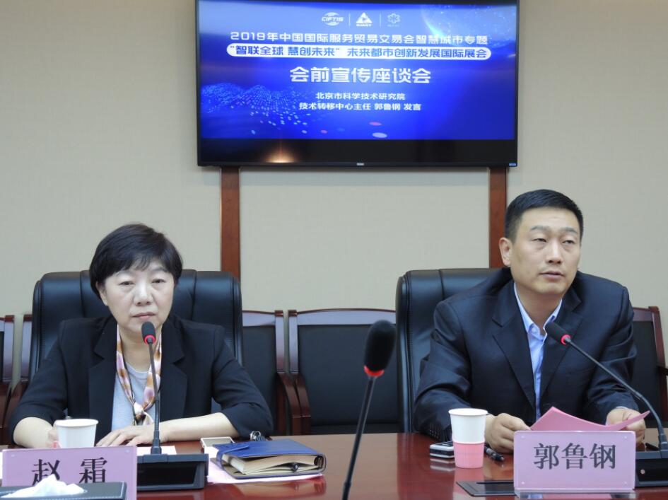 北京市科學技術研究院宣傳處長趙霜女士介紹活動背景及採訪議程安排,研究院技術轉移中心主任郭魯鋼介紹2019年京交會智慧城市專題活動亮點
