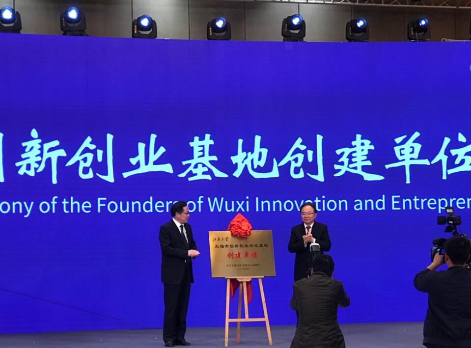 江蘇省委常委、無錫市委書記李小敏,江南大學黨委書記朱慶葆共同為「江南大學-無錫市創新創業示範基地創建單位」揭牌