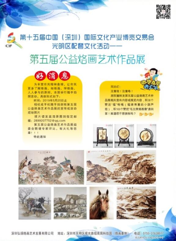 組委會負責人張守福介紹,本次活動不僅有深圳弘揚烙畫藝術發展有限公司、深圳市烙畫藝術協會、還邀請到了中國非物質文化遺產研究院、深圳市工藝美術行業協會、深圳市清風書研究院、光明區文化廣電旅遊體育局等單位共同支持本屆烙畫展,也得到第十五屆中國(深圳)國際文化產業博覽交易會的認可、並批復為文化配套活動,於5月15—18日在光明烙畫基地亮向市民。第五屆公益烙畫藝術展不緊為轄區市民獻上了精神食糧,也更是為建國70周年深圳建市40周年獻上了一份文化藝術「木與火」的賀禮。