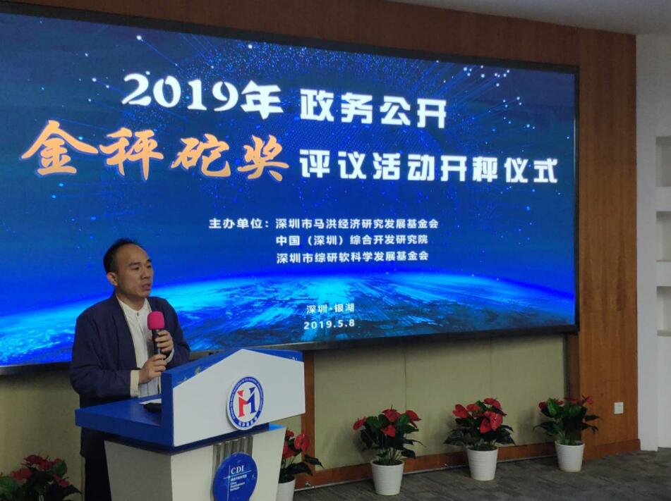 【香港商報網訊】記者 蘇偉 報導:5月8日上午,2019年馬洪基金會政務公開「金秤砣獎」評議活動開秤儀式在深圳銀湖CDI大廈舉辦,雙秤齊開、重磅出新!馬洪基金會創會理事長李羅力、馬洪基金會理事長、綜合開發研究院常務副院長郭萬達、深圳市資訊無障礙研究會創始人鄭衞寧出席並介紹評議規則。綜合開發研究院副院長武良成及智庫百人會副總召集人楊勤、張翔、李敢、饒錦興和30多位智者代表,羅湖區、南山區、龍華區、鹽田區和坪山區共10位政府代表,中國商報、南方都市報、深圳特區報、香港商報等多家國家及省市主流媒體代表以及中國郵政快遞工作人員等參加了本次「金秤砣獎」開秤儀式。智庫百人會副總召集人範軍擔任此次開秤儀式主持人。