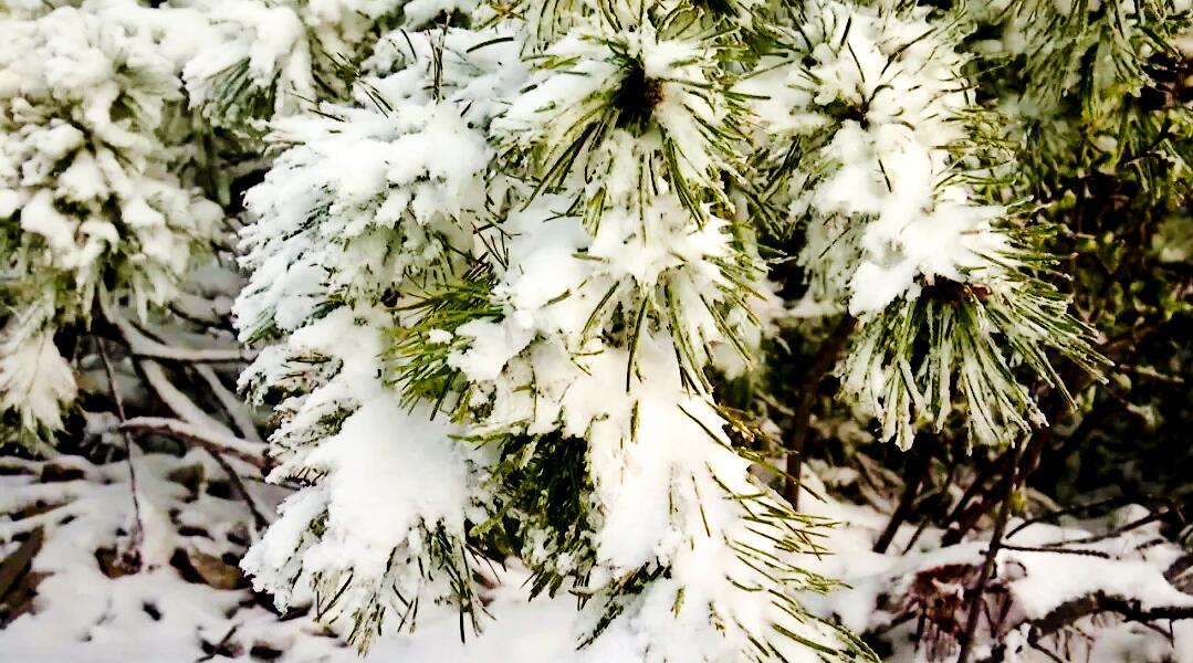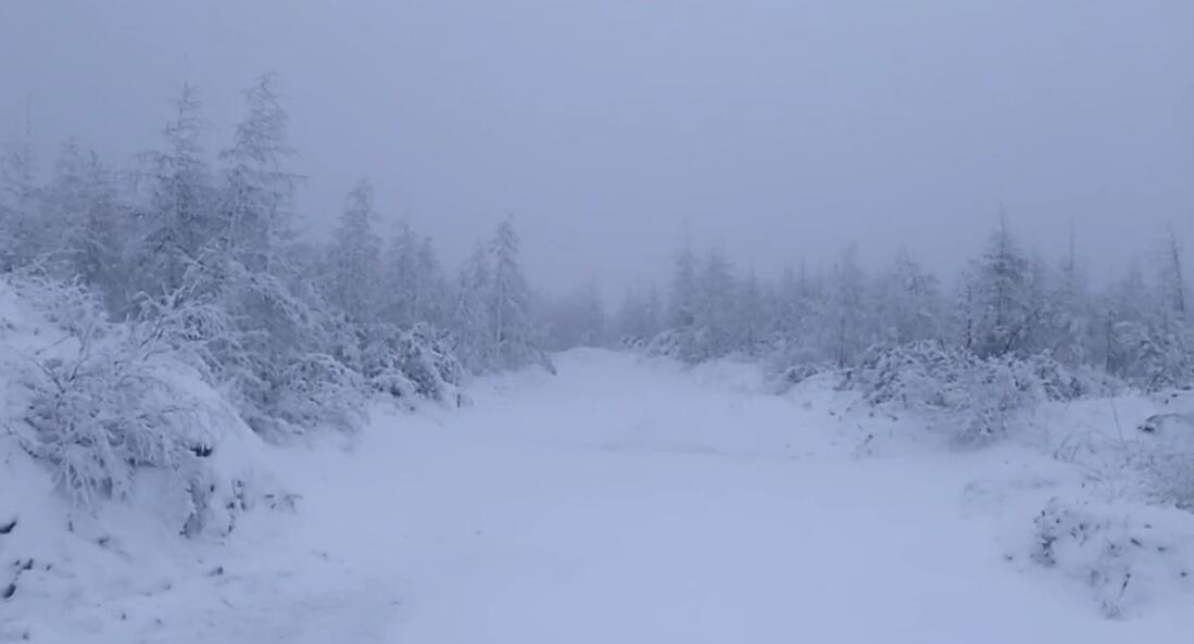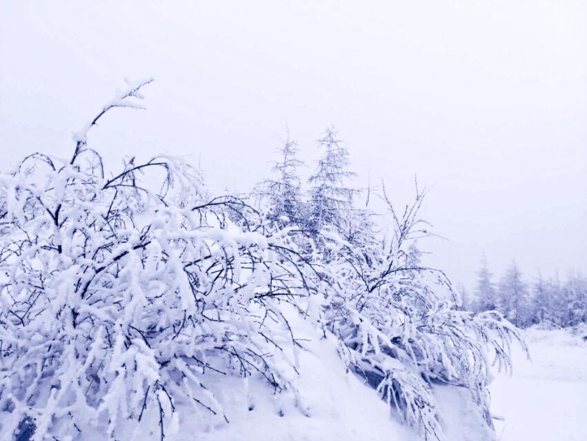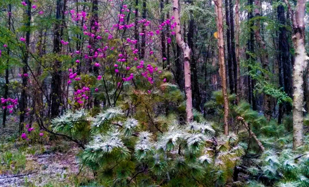凌晨3時許,在新林區宏圖東山景區,雪花綿綿,涼爽宜人,放眼望去,一片朦朧里卻又透出偃松的綠色生機和杜鵑花嬌艷綻放,上午10時許,降雪雖然停止,但蒼茫的林海已被裝飾成了唯美浪漫的童話森林。