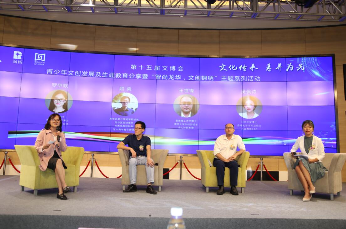 在隨後的「文化傳承,素養為先」青少年文創發展及生涯教育分享會上,龍華區第三實驗學校校長趙燊先生、國家青年千人計劃專家王世鋒先生、龍華區高層次人才羅伊默女士以及北京大學博士吳佩詩女士就青少年文體社科類素質教育現狀及發展進行了主題分享和圓桌討論。在分享會上,趙燊校長指出了中國現行基礎教育體系下素質教育面臨的問題和挑戰,同時也感謝龍華區經濟的快速發展和財政有力的支持讓學校能搭建更多特色課程和項目平台,也讓更多學生從中受益。接着,國家青年千人計劃專家、香港理工大學博士王世鋒先生則從高校教授的角度給孩子們深入剖析了「好好學習」四個字背後的深層含義,並用生動的例子和故事讓孩子們明白文化素質雙管齊下、左腦右腦同時開發的重要性。