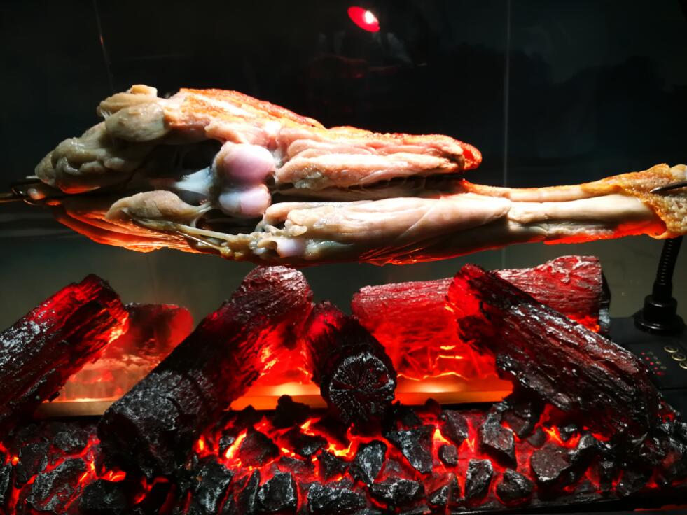 一次偶然機會,賈永梁認識了玉雕大師鄒萬通,一位專門創作寫實作品的玉雕大匠,他帶着塊原石去拜訪,當鄒大師看到這塊璞玉,脫口而出:哇!烤羊腿!最終,賈永梁與鄒萬通大師合作,創作這塊「烤羊腿」!這快璞玉外形神似羊腿,紅、黃、紫、白四色是創作的核心!紅的俏色羊皮在烤爐上烤到起泡又焦的味道;黃皮參紫色更加像有血水的肉色,所以俏色為羊腿上的瘦肉;烤熟的羊腿肉是一條條肉絲,逼真;淡淡的紫色剛好在羊腿的中間俏色為筒骨,在其上再雕些肉絲;白色的俏色為筒骨旁邊的嫩幼骨;再把筒骨和腿骨頭雕成被烤肉人故意掰開的感覺。於是,一件足以亂真的曠世奇作問世!