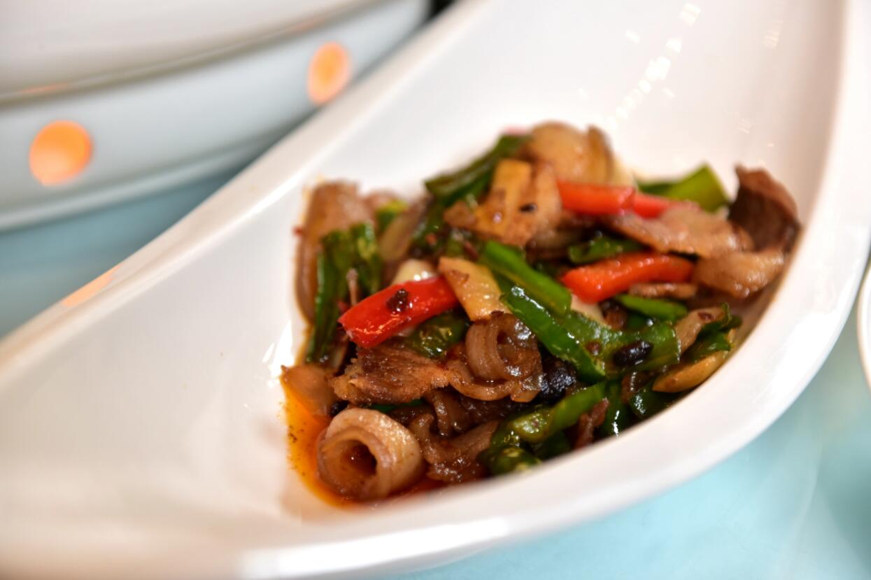 與平時見到的家常回鍋肉不一樣的是,宴會上的這道回鍋肉,選擇的是內江的特產黑豬肉作為原材料。