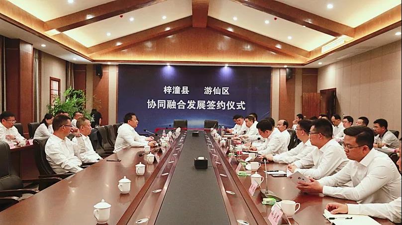 梓潼縣委書記周琳,縣委副書記、縣長賀旺,遊仙區委書記江彬,區委副書記、區長陳華斌等雙方有關領導出席簽約儀式。