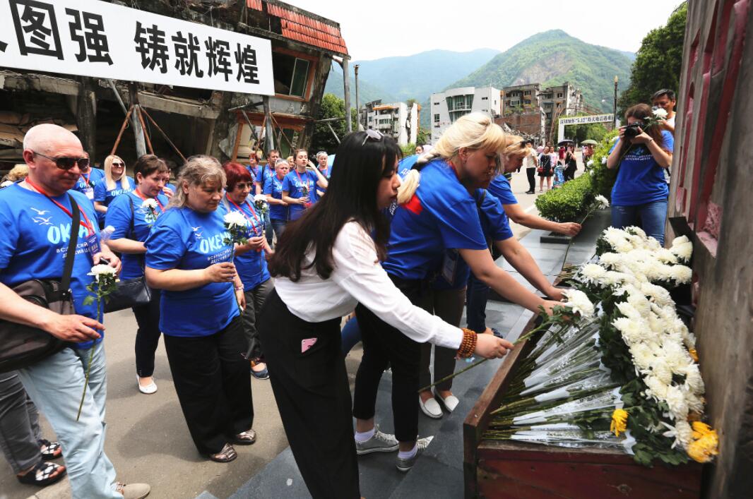當天上午,代表團參觀了北川老縣城地震遺址及地震紀念館。在北川老縣城遇難者公墓前,代表團成員向地震遇難者敬獻鮮花,靜默肅立、鞠躬致敬。「北川老縣城的遺址被保留下來,為研究地震、防範地震災害提供了寶貴素材。」聽完工作人員的介紹,代表團團長娜塔莉雅·謝拉米娜表示,今後「海洋」中心也將加強對學生的防災教育、生命教育。