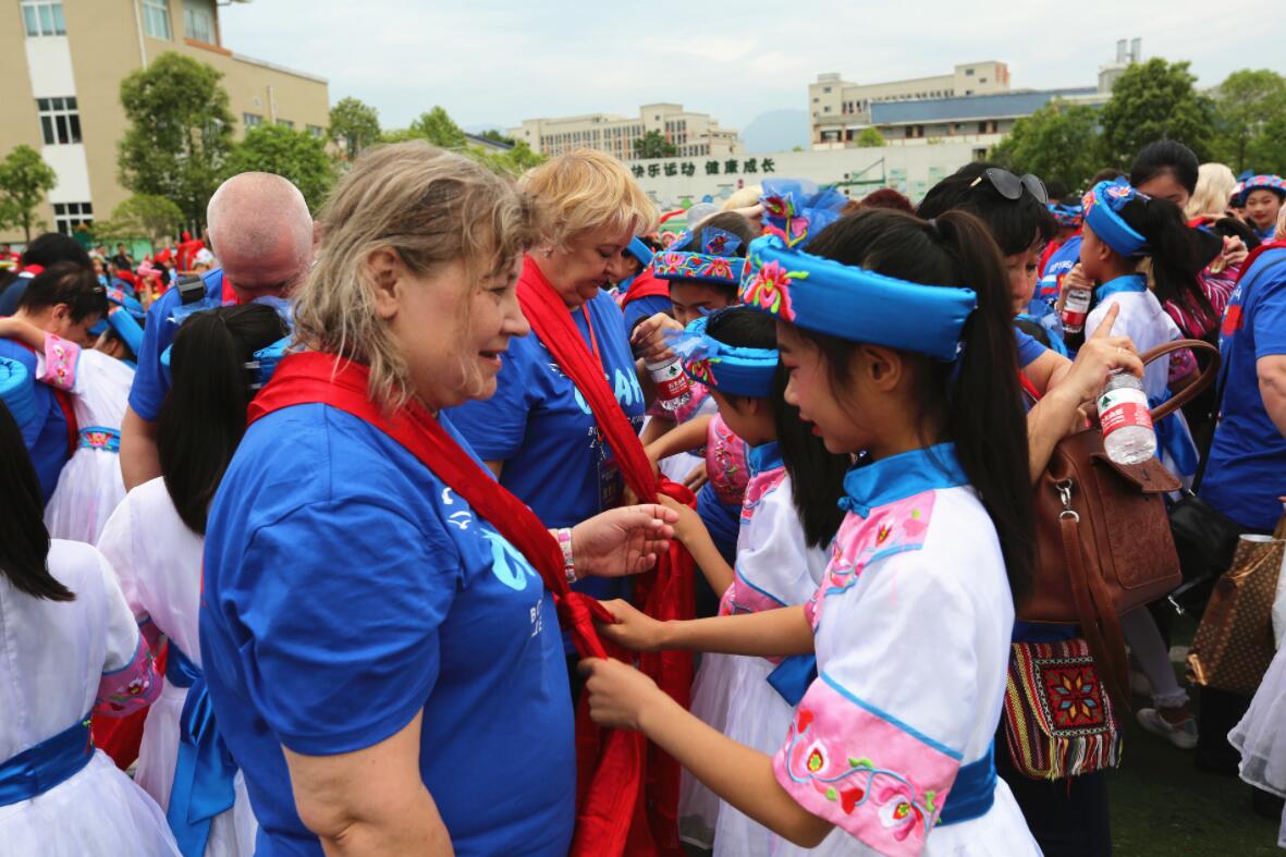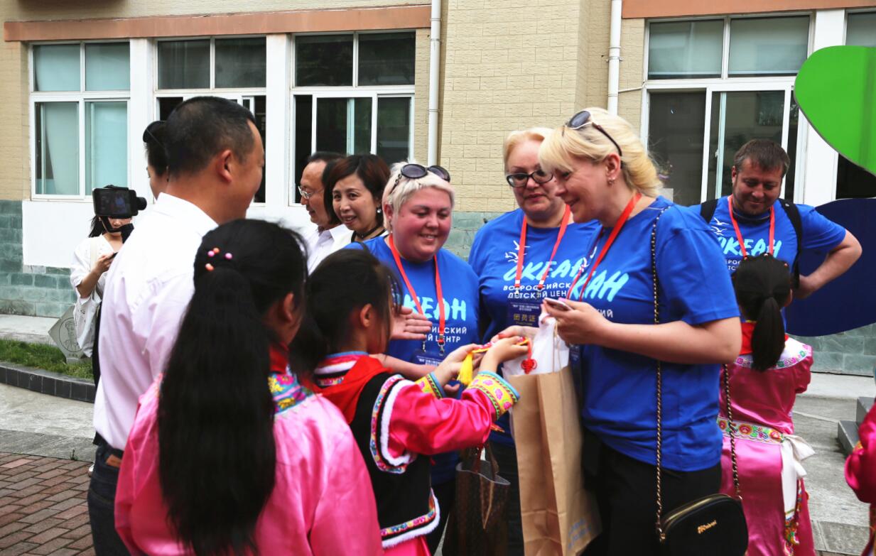 最後,永昌小學師生將羌紅送給了俄羅斯代表團成員,而娜塔莉雅·謝拉米娜將一個有「海洋」中心標誌的「方向盤」吉祥物贈送給該校師生,她說:「這寓意着中俄兩國有同樣堅定的方向,我們兩國之間的友誼永存。」