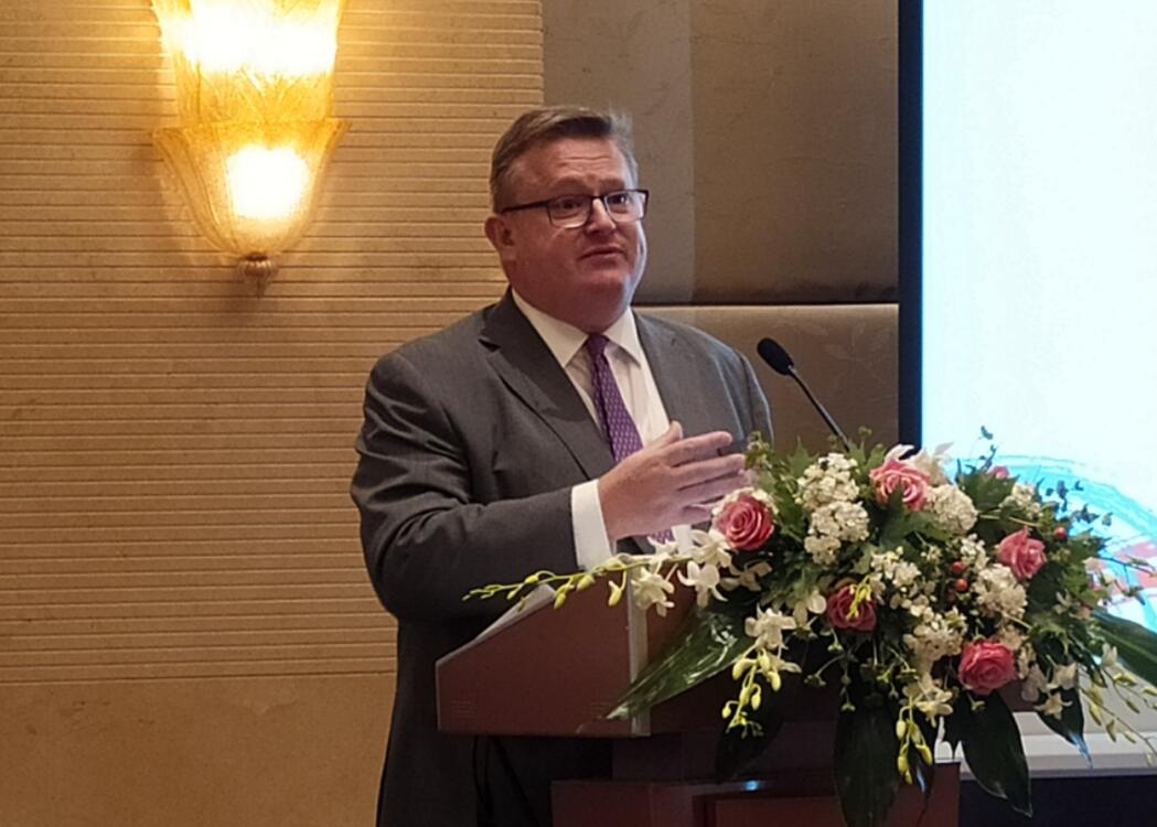 香港特区政府投资推广署署长傅仲森向與會嘉賓介绍内地企业应如何善用香港国际营商平台优势