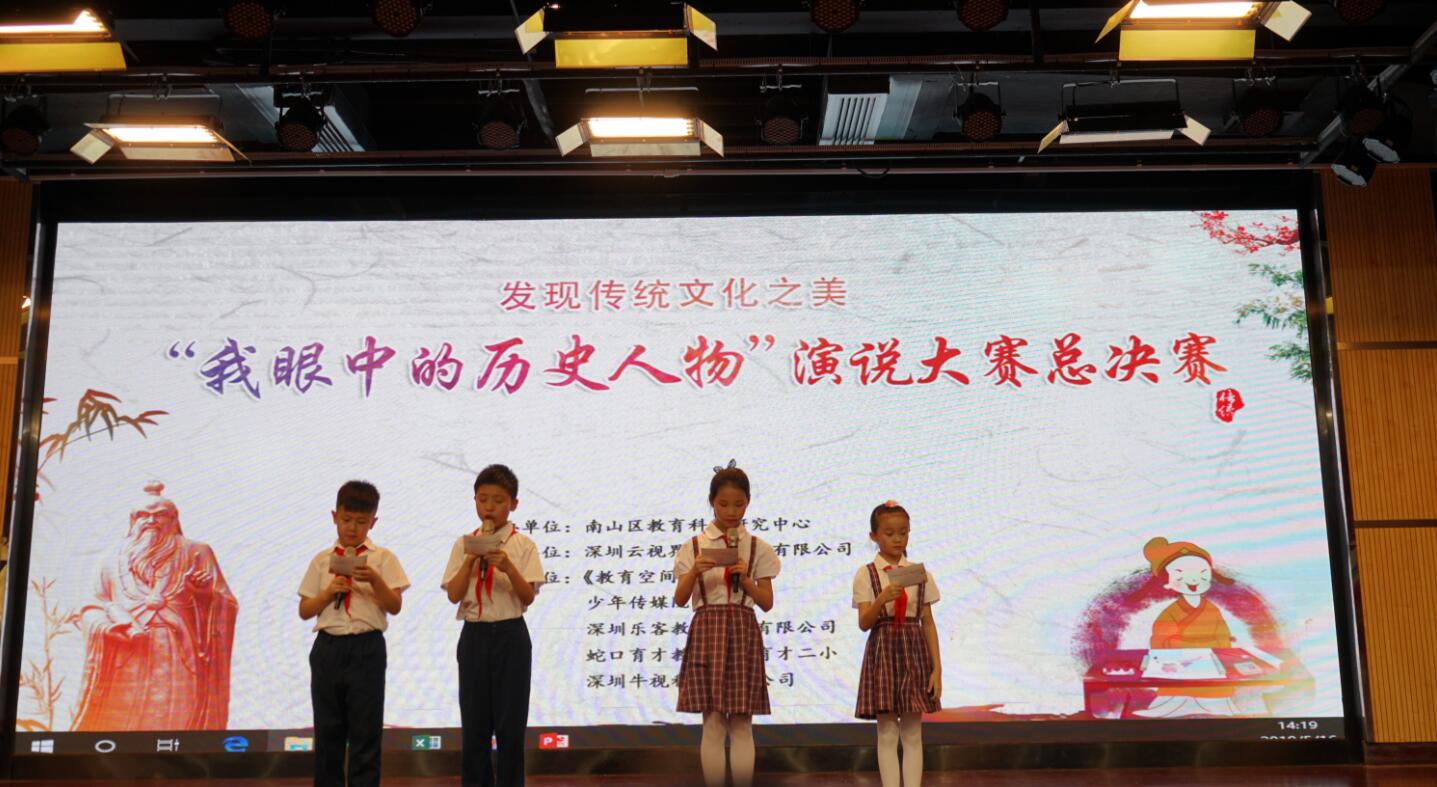 【香港商報網訊】2019年5月16日下午,由深圳市南山區教育科學研究中心主辦,雲視界文化承辦,《教育空間》欄目、少年傳媒院協辦的第二屆「發現傳統文化之美——我眼中的歷史人物」演說大賽決賽在蛇口育才教育集團育才二小隆重舉行。大賽組委會特聘關心下一代工作委員會常務副主任吳聲洛、資深話劇演員蔡印時教授、南山區關公委「五老」講師團團長薄忠信教授、文化學者彭慶元教授、央視資深導演、製片人李海導演、全國百佳語文教師白傳開教授出任本次決賽主評委。南山區教科中心辦公室主任趙小平、教研室副主任高乃松蒞臨決賽現場指導工作。