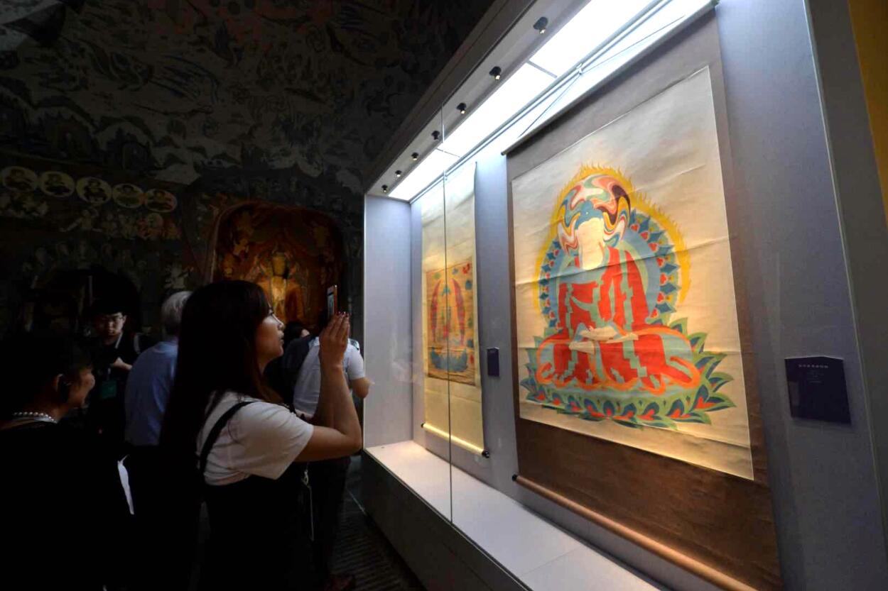 走進「面壁敦煌」展廳內部,一個實景復原的「敦煌石窟」呈現眼前,幽暗的石窟中,張大千和助手手持忽明忽暗油燈,正在孜孜不倦的臨摹描繪。如此逼真的場景,讓現場嘉賓讚嘆不已。