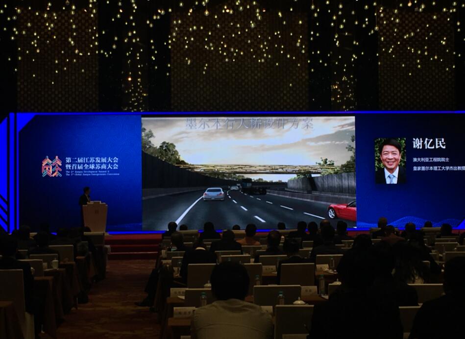紫金山科技論壇現場,澳大利亞工程院院士、皇家墨爾本理工大學傑出教授謝億民以「如何創造既美觀又高效的建築與橋樑」為題,分享更輕盈、更美觀的建築與橋樑世界