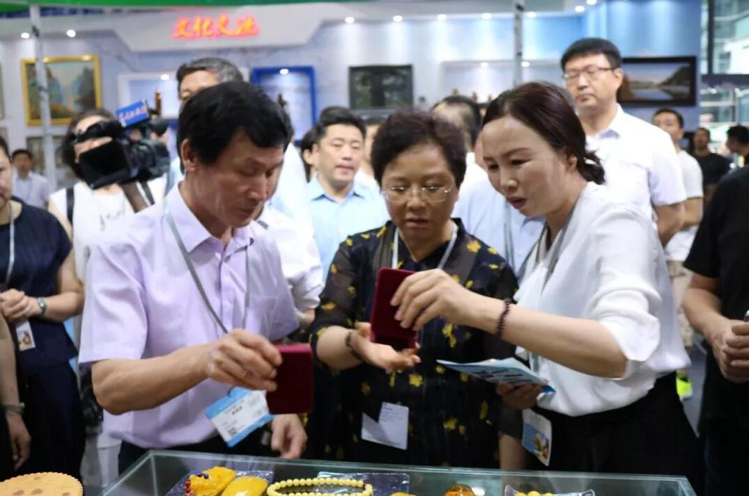 黑龍江省委常委、宣傳部長賈玉梅(中)在塔河縣委常委、宣傳部長陳秀霞(右)的陪同下參觀了塔河縣樺樹皮國等展品