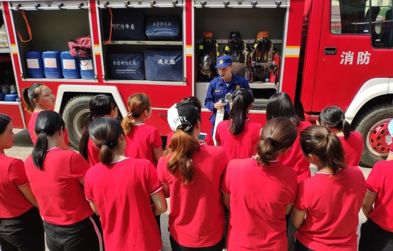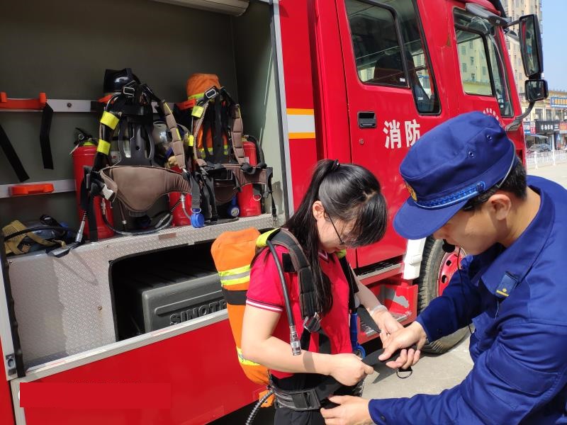 老師們在大隊宣傳人員的帶領下,來到了器材裝備展示區參觀了隔熱服、避火服、防化服、機動鏈鋸、金屬切割機、生命探測儀等各類器材裝備。面對這些從未見過的「神奇裝備」,老師們顯得既興奮又好奇,對消防工作產生了濃厚的興趣,不斷地向解說人員提問,解說人員耐心細緻地為她們講解了各類器材裝備的名稱、功能和用途,並現場進行了操作演示。在消防知識學習環節,宣傳員以貼近實際、實用性強的消防常識入手,為教師們詳細地講授了火災預防、處置的方法、119報警電話以及火場逃生自救等知識,同時邀請老師試穿戰鬥服、扣上消防頭盔、使用消防器材,讓她們過一把「消防癮」,激發了她們的參與熱情。