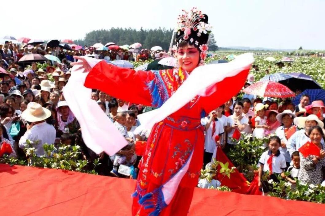 贛劇選段《郭曖打金枝》,女演員悠揚、婉轉的唱腔,隨着初夏的微風,絆著陣陣花香飄蕩。(王忠華、範益群攝)