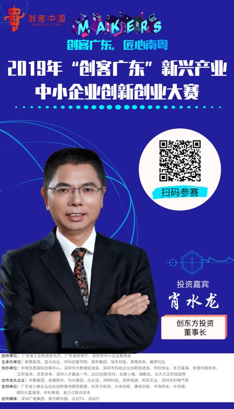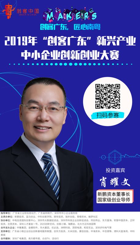 【香港商報網訊】記者 蘇偉 報導:十大上市及龍頭企業駐賽支持,深圳唯一省級雙創賽事。2019年 「創客廣東」新興產業中小企業創新創業大賽近日正式啟動 ,該大賽是經國家工信部、廣東省工信廳、廣東省財政廳、深圳市中小企業服務局聯合指導並審核批准的由十年以上創業服務經驗的深圳新鵬投資主辦,聯合李總理點贊的中科院深圳先進院直屬機構中科創客學院、廣東省小微企業雙創示範基地運營商藍馬創業、十多年創業投資經驗的青橙資本、國家級孵化器運營商朋年集團、深圳市級科技文化產業基地運營商瑞豐創投以及國家級眾創空間觸夢社區、深圳市大數據促進會、深圳市科技企業創新促進會、深圳市未來產業促進會等單位聯合承辦。