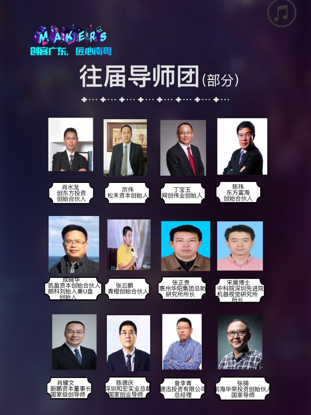 大賽設有「賽前培訓」、 「路演比賽(初賽、復賽、決賽)」、「大咖論壇」、「龍頭企業命題需求發佈」等豐富多元跨界活動,比賽路演期間中集集團、金蝶軟件、華大基因、優必選、洲明科技、茂碩電源、和宏實業和深圳步科電氣等十家上市和龍頭企業高管將進駐比賽現場親自參與發佈創新需求並觀摩支持,同時邀請中科院、港科大、深圳大學、南方科大、清華北大研究院、哈工大的學術專家和松禾資本、同創偉業、東方富海、創東方投資、軟銀中國資本、深圳人才基金(一號)金沙江聯合資本、康佳創投、正軒投資、彭年創投、國金投資、中海資本、大米創投、旦恩資本、中電信息國際創客中心、港科大藍海灣、北大方正科技園、中吉號、創客小鎮、2025 創新空間、瑞鵬會、百富源資本、凱盈資本、中力資本、綠石創投、新恆利達、中科美城等數十家創業投資和科技服務機構派出專家直接參與評審和對接培育。