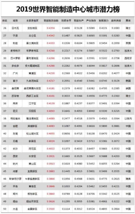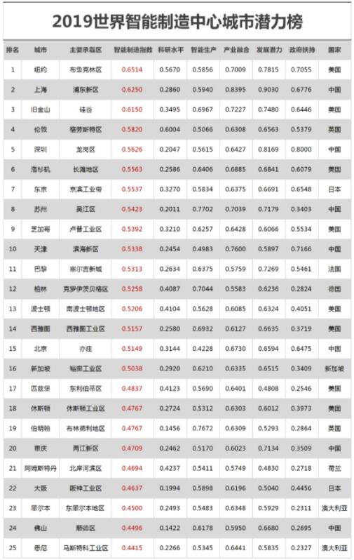 智能製造發展潛力排名:上海深圳高居世界前二,紐約第三。榜單顯示,世界智能製造發展潛力前十城市分別為中國上海、中國深圳、美國紐約、美國舊金山、法國巴黎、中國蘇州、中國重慶、美國洛杉磯、韓國首爾、日本東京。此單項排名中,亞洲城市尤其是中國城市表現不錯。其中亞洲入榜世界前十的城市有6個,分佈在中國、韓國、日本等亞洲三強中。中國的上海和深圳在智能製造方面潛力無限,高居世界前二。