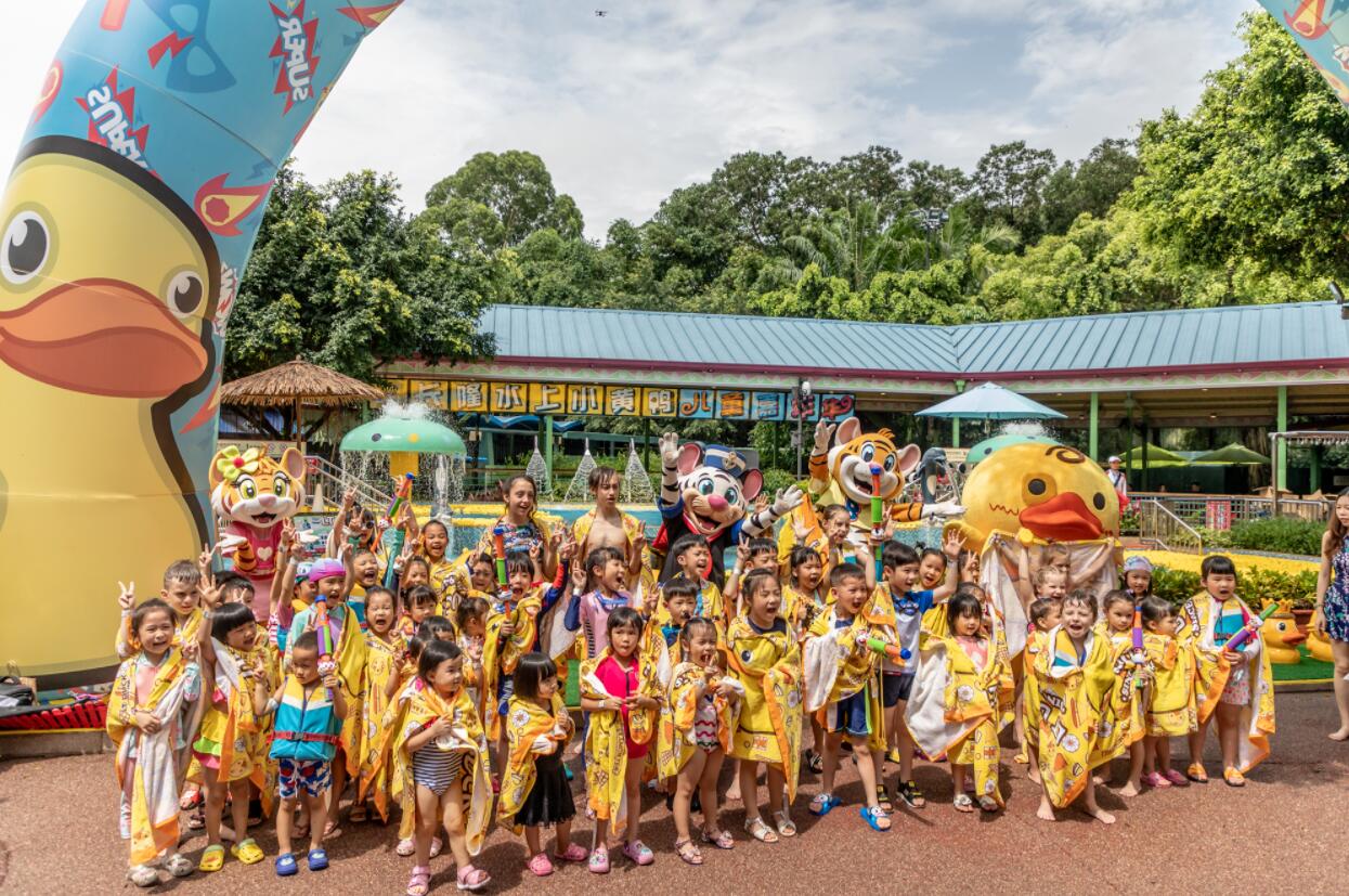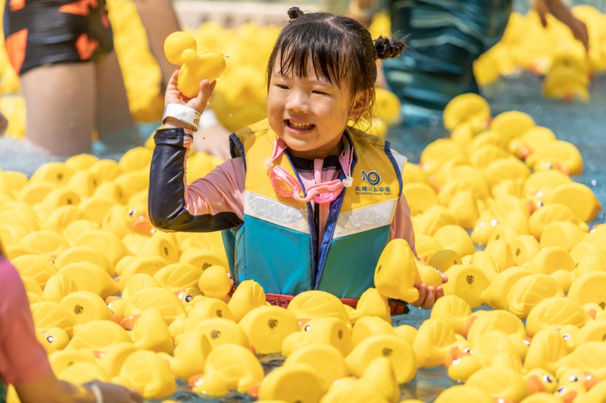 作為陪伴大小「玩水家」一同成長的小夥伴,橡皮小黃鴨成為童真的快樂和幸福的象徵。今年6月,長隆水上樂園攜手LT Duck,推出「長隆水上小黃鴨兒童嘉年華」主題活動,設立三大小黃鴨的主題體驗區:第一個體驗區位於「奇妙親子水城」,孩子們在溫水按摩池內將會邂逅超過一萬隻小黃鴨。在按摩池前,長隆水上樂園還頗具匠心地打造了一座小黃鴨拱門,與「奇妙親子水城」的動物主題拱門遙相輝映,搭配上多個不同造型的小黃鴨主題公仔,活動當天成為親子玩水家庭的熱門打卡點,定格樂享天倫的溫馨瞬間。