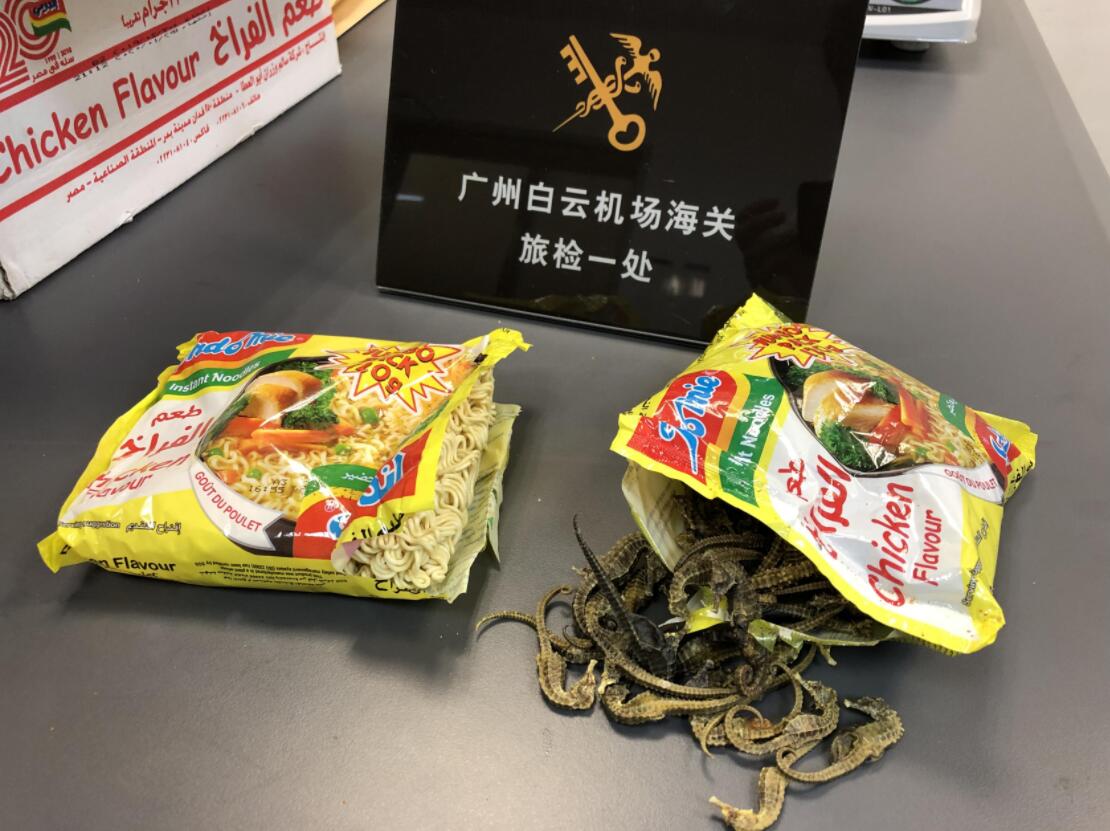 5月18日,廣州海關隸屬白雲機場海關也曾在同一班次的航班中查獲3名外籍旅客以相同手法違規攜帶海馬乾進境,分別查獲海馬乾2.2、2.3、2.8千克。上述四宗違規攜帶海馬乾的「即食麵」包裝一致,封裝完整,外觀上與普通即食麵無異,有批量製作、分批進境的嫌疑。
