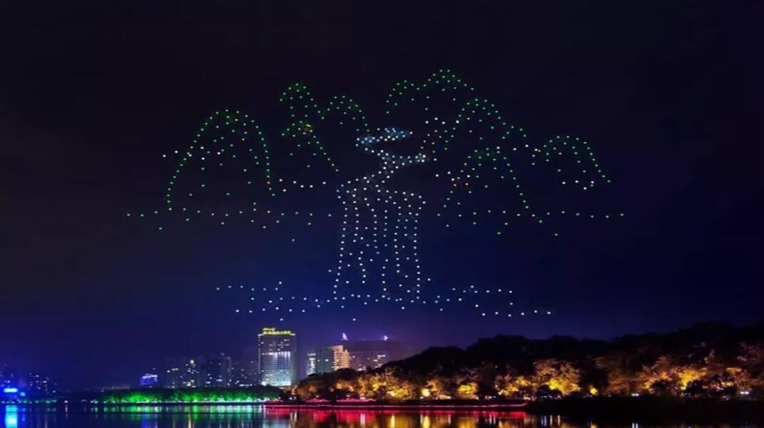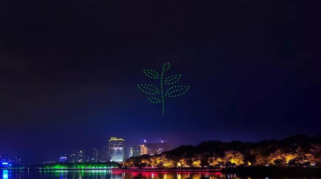 在現場,600架無人機在美麗的八裡湖緩緩升空,在絢爛的城市光影背景下變換成廬山的剪影,從這座山開始,講述一個關於茶的故事。接着,廬山的剪影變換成茶幼苗,幼苗逐漸成長出粗壯的樹幹和茂密的樹葉,經歷了風吹雨打,依然茁壯成長。採茶的季節又到了,此時夜空中出現了一個背着茶框的小姑娘,正在採摘著新茶。隨後,空中慢慢浮現出茶壺,從壺中倒出「茶」字。最後,「茶泉雙秀 大美九江」,作為結束語,寓意2019九江國際名茶名泉博覽會完滿成功,九江歡迎天下客。