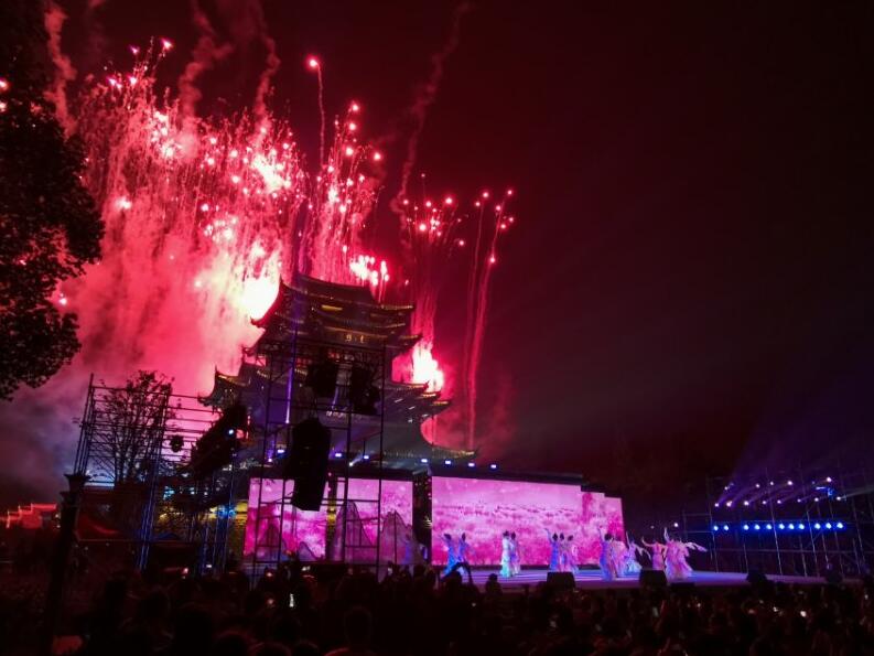 晚上8時, 「薪火東洲」文藝晚會在炫目的投影秀《天地大儒》中拉開帷幕。近20分鐘的焰火表演中,五光十色的煙花隨着音樂的節奏,按篇章順序依次綻放。立柱特效煙花不時在高空打出大雁、帆船等各種組合圖案以及「船山」等字樣;最具創意的是100架無人機參與演出,在空中擺出各種造型,一幅幅由煙花呈現的立體動態情景畫卷徐徐展開,吸引近10萬市民走上街頭。(唐竟淳 蔣劍)