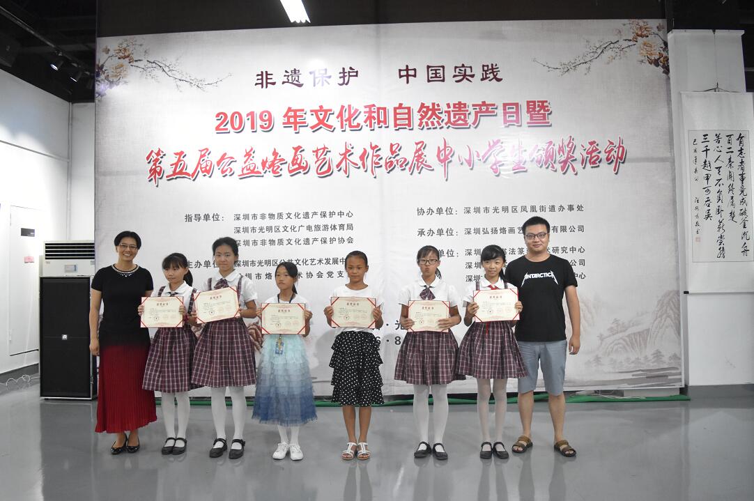 【香港商報網訊】6月8日上午10點,2019「文化和自然遺產日」暨第五屆公益烙畫藝術作品展中小學生頒獎儀式活動,在光明烙畫基地舉行。主題為「非遺保護 中國實踐」。由深圳市非物質文化遺產保護中心、深圳市光明區文化廣電旅遊體育局、深圳市非物質文化遺產保護協會指導;深圳市光明區公共文化藝術發展中心、深圳市烙畫藝術協會黨支部聯合主辦;深圳市光明區鳳凰街道辦事處協辦;深圳弘揚烙畫藝術發展有限公司承辦;深圳市嘉實寶文化傳媒有限公司、光明區陽光社會工作服務中心支持。