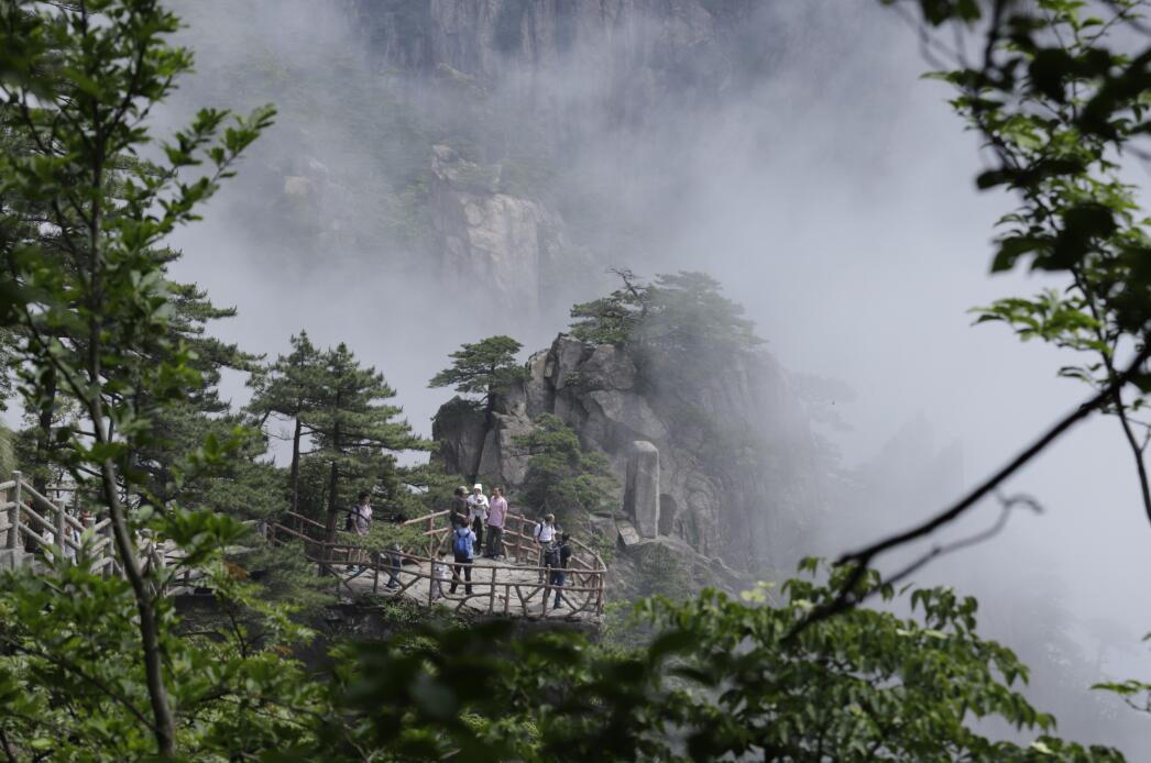 端午假期,黃山風景區低山區群峰聳翠、滿目蔥郁,高山區墨綠色的黃山松和淺綠色的落葉喬木交織著,有的大片大片地覆蓋在峰腰上,像為山峰披上了一塊塊錦繡,有的沿着岩石縫隙鑲嵌在岩壁間,像為山峰繫上了綠色腰帶。薄薄的霧氣在峰巒間緩緩流動,山峰像披上了一件飄動的輕紗。山風湧起,霧氣緩緩升騰,山谷間白茫茫的一片,山峰淹沒在霧靄中。一會兒,霧氣漸漸散去,山峰慢慢露出真容。變幻莫測的景色,引得眾多遊客不時駐足拍照留念。