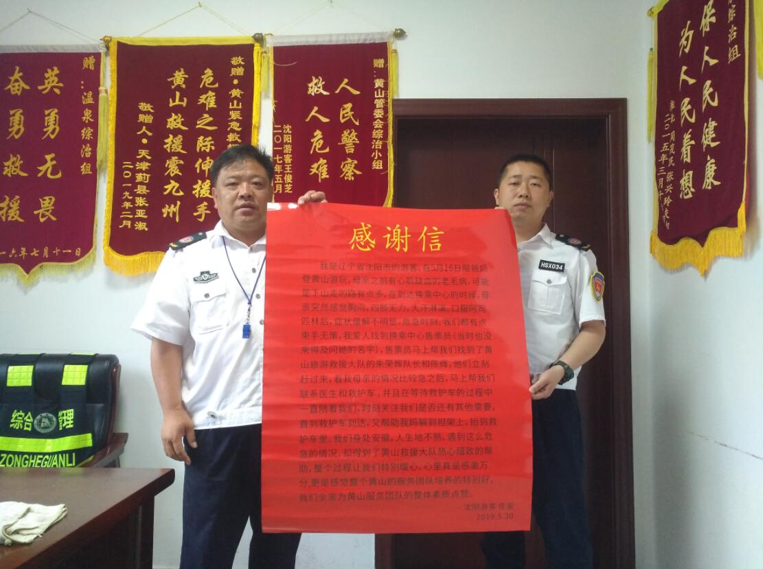5月26日,瀋陽佟女士的母親遊玩黃山下至玉屏索道溫泉站時,突然感覺胸悶,四肢無力,大汗淋漓。危急時刻,黃山旅遊救援大隊的朱榮輝隊長和陳輝立刻趕來,幫助佟女士一行聯繫醫護人員,並不時予以關切詢問,讓她們倍感溫暖。佟女士稱她心裡真是萬分感激,更是感覺整個黃山的服務團隊培養的特別好,她代表全家為黃山服務團隊的整體素質點贊。