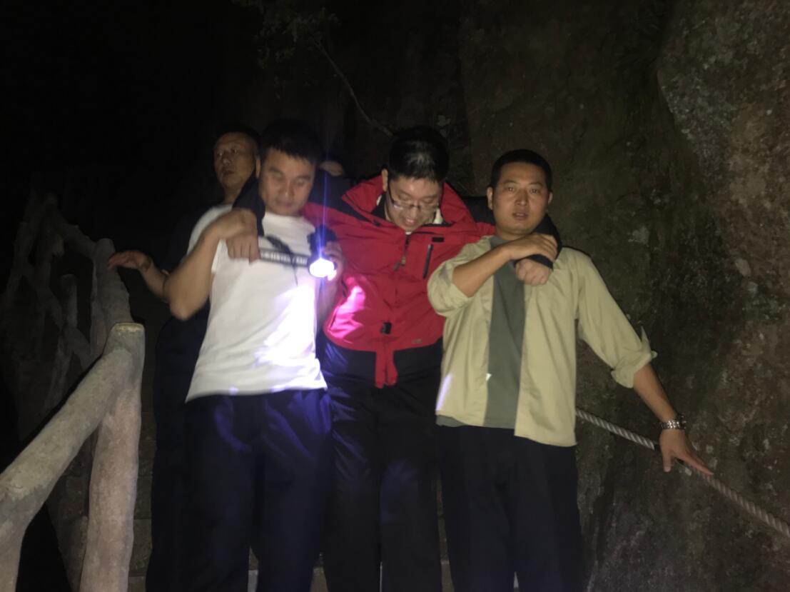 6月3日夜20時,南京的劉某在西海大峽谷一環與二環之間,因體力耗盡和膝蓋舊傷影響無法行走半步,劉某身高1米86,體重達210斤,同行的父母年事已高,在天色已黑難辨方向的情況下,一家人幾乎陷入了絕境,萬般無奈之下撥打了景區救援電話求助。天海綜治組組長操文明、副組長楊緋接報後,迅速帶領綜治隊員、公安民警、防火隊員及白雲賓館、地軌纜車保安等人員從天海乘坐地軌纜車輾轉趕往現場,經一個多小時搜索後終於找到劉先生。救援人員考慮到夜間救援危險係數高,坡陡路險,且劉先生身材高大體重較重不適宜使用擔架抬運,採取了兩人架扶方式,一步一個腳印慢慢挪動前行,前後安排數名人員照明,確保遊客安全。經過4個小時的艱苦努力,直至晚12時終於將遊客一家平安護送至白雲賓館,劉先生及家屬一再表示非常感謝並掏出現金予以回報,被救援人員婉言謝絕。