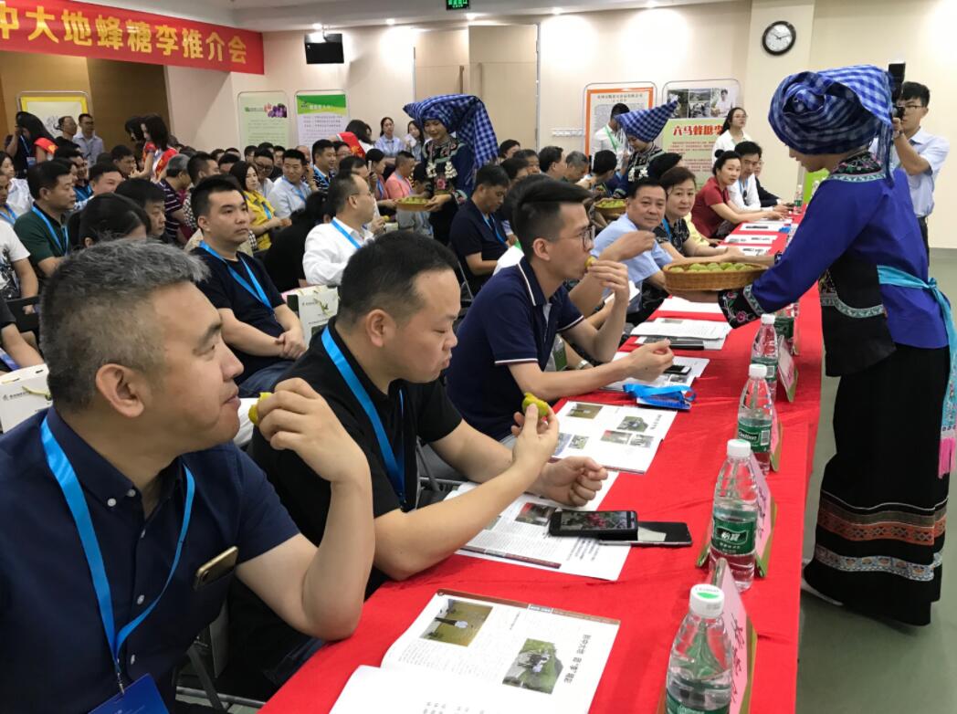 【香港商報網訊】18日,由貴州黔中大地農業開發有限責任公司和深圳市海吉星國際農產品物流管理有限公司共同舉辦的對口幫扶產業扶貧蜂糖李品鑒推介會在深圳市龍崗區海吉星農批市場舉行。貴州省人民政府駐廣州(深圳)辦事處副主任林小美、貴州省各地駐深圳辦事處負責人、深圳貴州商會代表、企業銷售代理商代表及大灣區主流媒體等200餘人參加。現場播放了蜂糖李宣傳片,展示了果品產地布依族風情,與會領導、嘉賓、媒體界及當地市民還進行了品鑒,預計此次可推介銷售10萬斤蜂糖李。