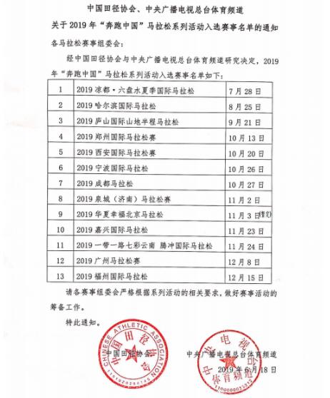 據了解,此次中國田徑協會、中央廣播電視總台體育頻道發佈2019年「奔跑中國」馬拉松系列活動入選賽事名單,共有13個賽事入選。其中,11個賽事為初次入選。
