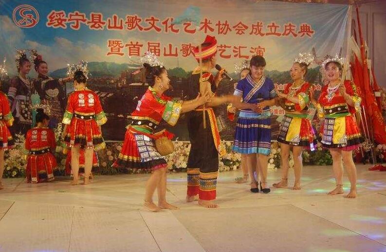 飯養身,歌養心。綏寧苗侗群眾自古以來用山歌表達自己的喜怒哀樂是一種生活常態。綏寧山歌它具有宕蕩起伏,婉轉悠揚,悅耳動聽的特點,動聽的音律彷彿把自己帶入一個空曠靈動的青山秀水境界中,把握其音律唱腔是有一定難度。苗族歌手阿苗千千、侗族歌手王馨就從綏寧山歌中汲取營養,走出大山,唱響全國。