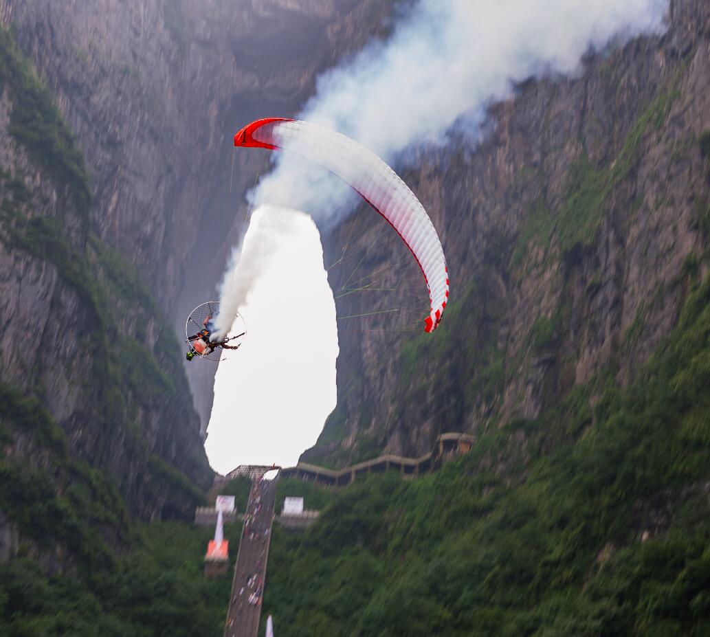 2019“極限飛蕩”動力傘特技國際大師賽是首次在張家界市舉辦的世界最高技術水準的國際動力傘特技表演活動,包括繞標競速賽、花式技巧賽、編隊飛行表演以及創意組合表演。(張思靜 丁雲娟)